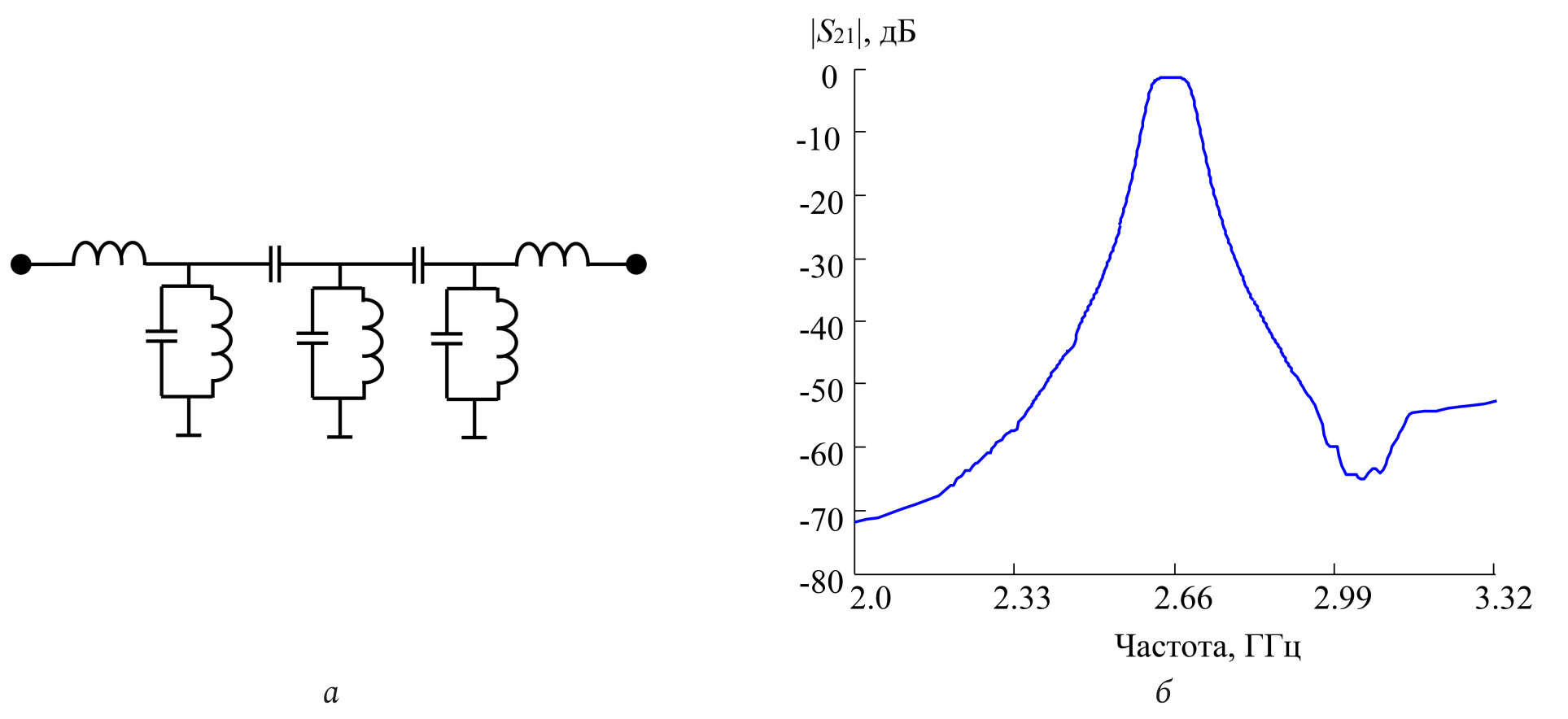 Рис. 7. Трехзвенный полосовой Чебышевский фильтр: а – многослойная керамическая структура; б – экспериментальная АЧХ