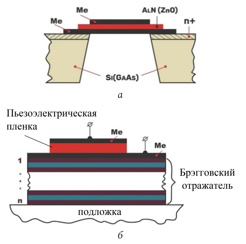 Fig. 11. Bulk acoustic wave (BAW) resonator structure: a – thin film membrane resonator; b – multilayer resonator with acoustic isolation from the substrate