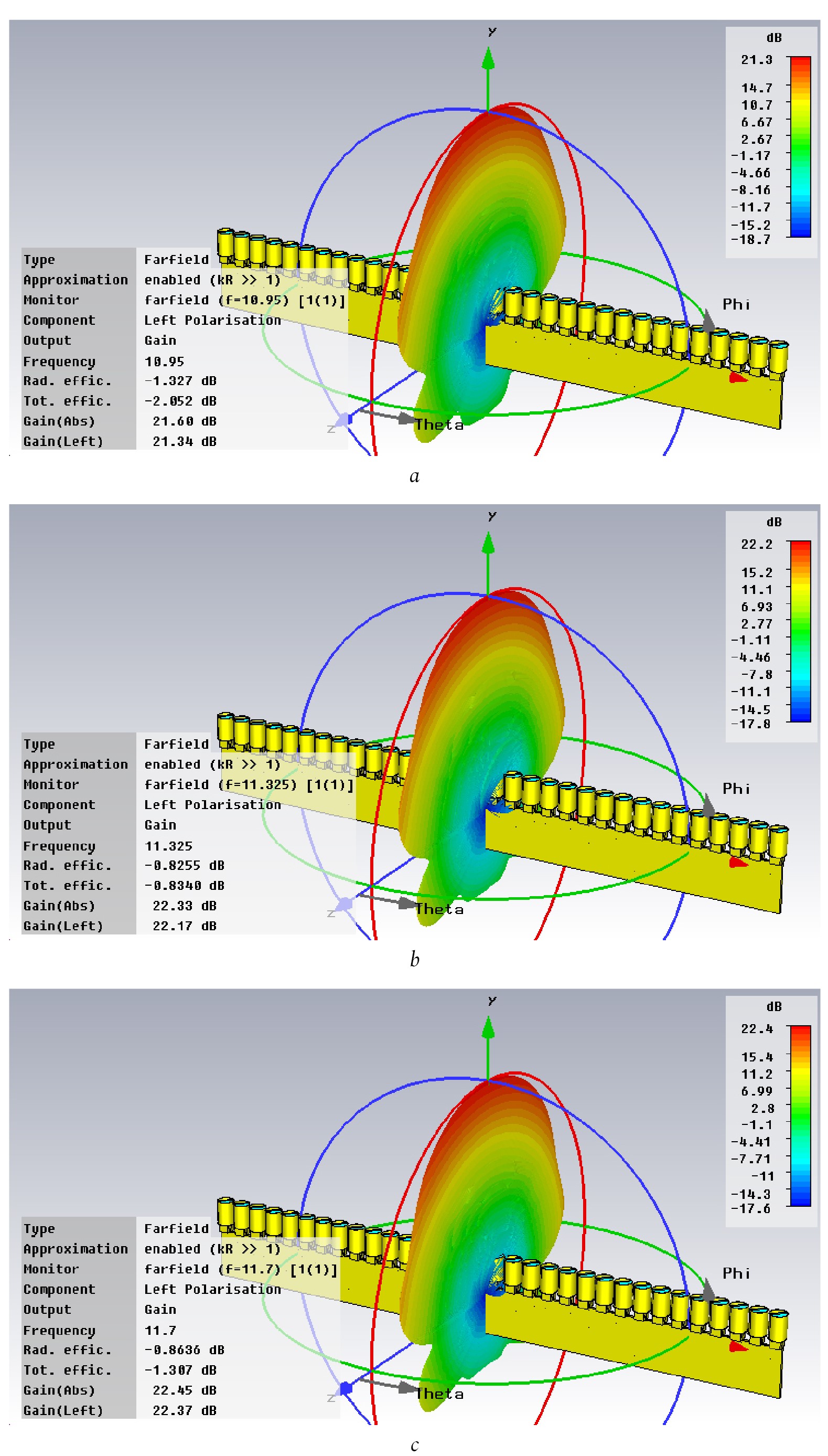 The gain at 10,95 GHz is 32,5 dB (normal) and 31,2 dB when the beam is deflected ±37,5° in the angular-local plane (excluding losses in the Rotman lens and commutator).