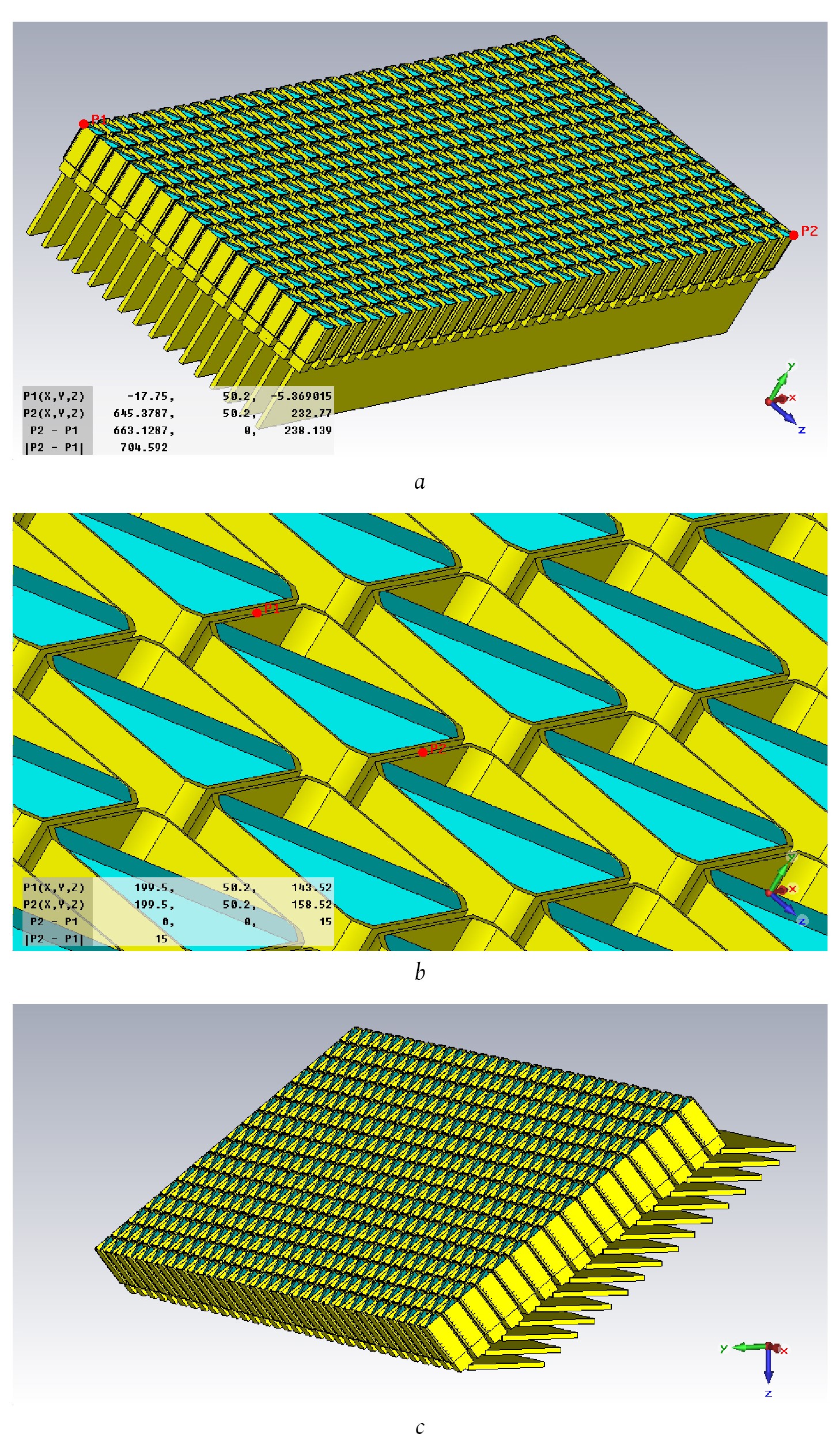 Fig. 9. Model of a flat antenna array composed of 16 linear antenna arrays: a – flat antenna array of 32 × 16 elements, composed of 16 linear antenna arrays. Aperture dimensions – 665,5 × 238 mm2; b – period in the angular-local plane – 15 mm (reduced in order to reduce the level of side lobes during wide-angle scanning); c – phased array with 32 × 16 elements with power dividers located horizontally. The phased array aperture is tilted at an angle of 37,5 degrees in the elevation plane. The height of the modified phased array is 175 mm. The depth of the phased array with power dividers is 262 mm. Headlight array width – 665,5 mm