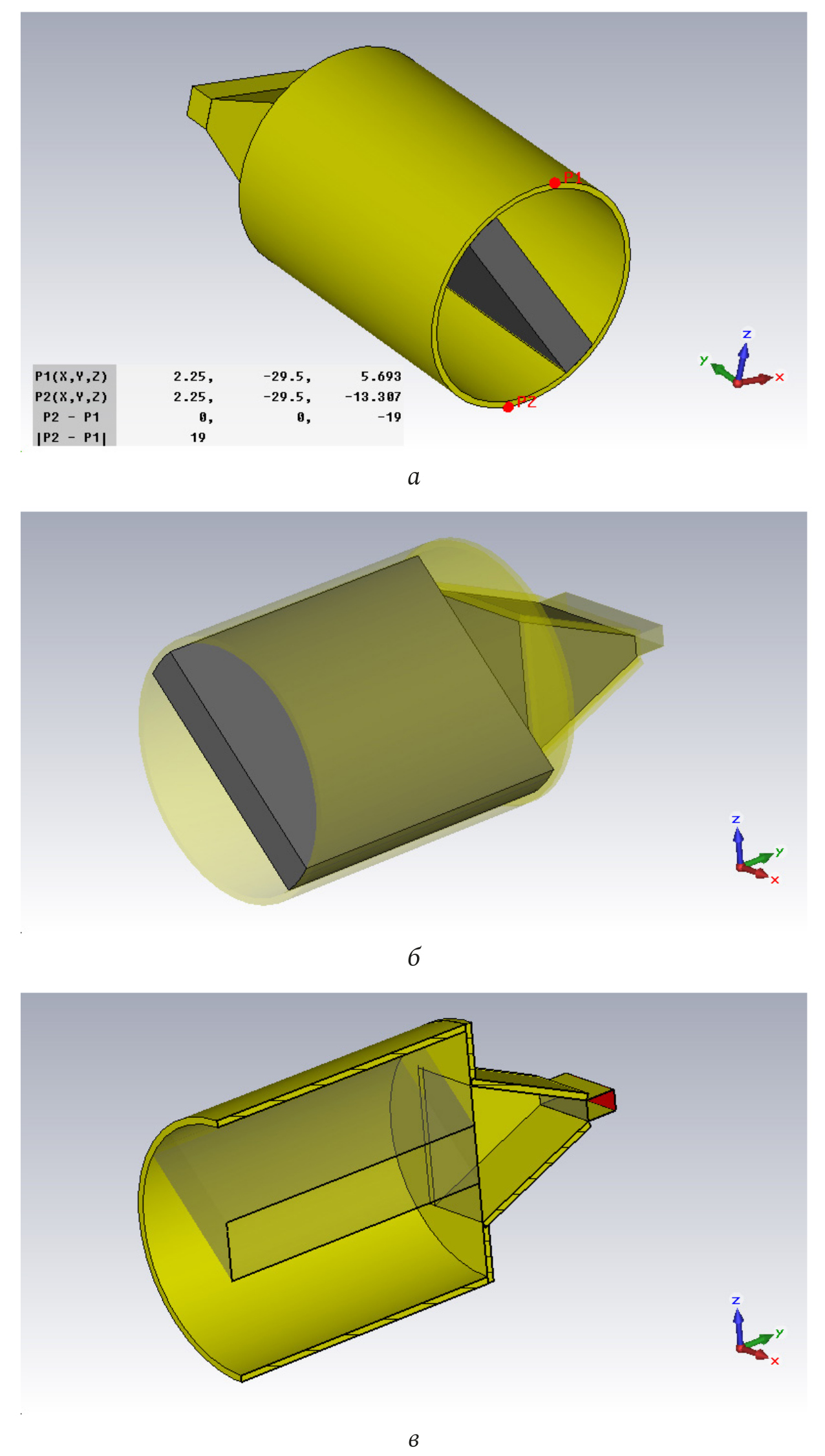 Fig. 1 shows a model of an antenna element based on a circular waveguide with an inner diameter of 18 mm and a dielectric plate whose plane is oriented at an angle of 45° to the force lines of the electric field strength vector. The circular waveguide is powered with a linear-expanding transition from the rectangular waveguide to the square waveguide, completely filled with polystyrene as dielectric, to realize the necessary spatial orientation of the plate in the circular part of the waveguide, as well as to reduce reflections from the junction of the square and circular waveguide.