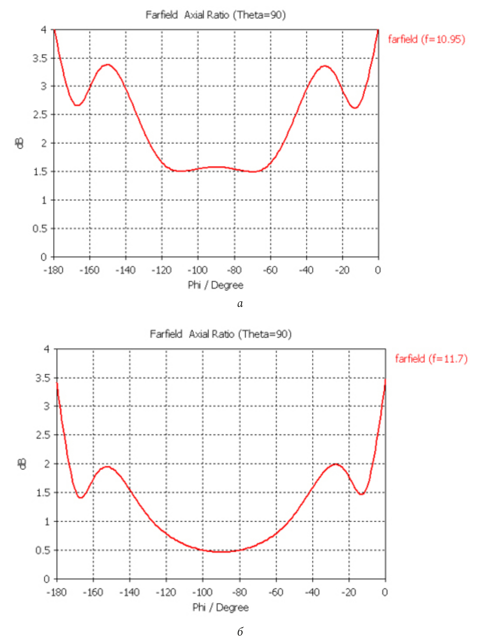 At the lower frequency of 10,95 GHz of the analyzed range, the axial polarization ellipse ratio does not exceed 3 dB in the 90° wide angle sector (Fig. 4, a); at the upper frequency of 11,7 GHz of the analyzed range, the polarization ellipse ratio does not exceed 3 dB in almost the entire hemispherical space (Fig. 4, b).