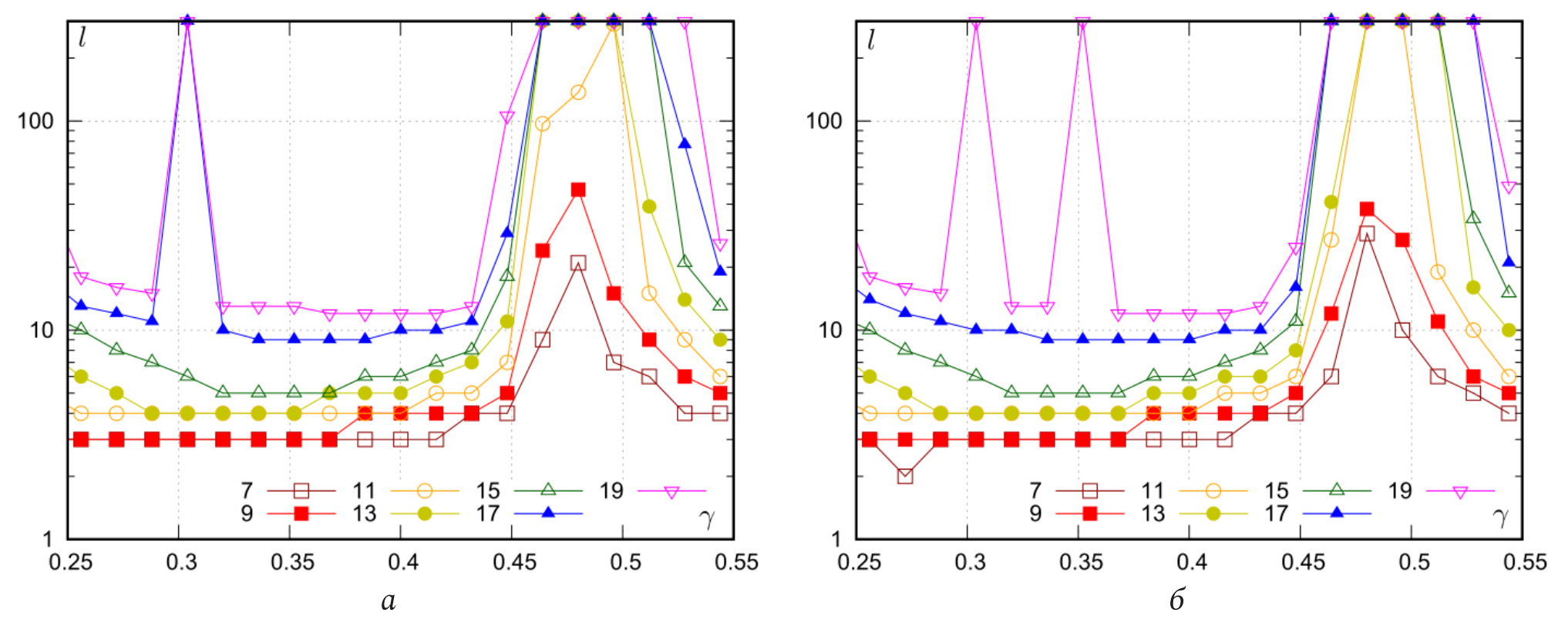На рис. 3 показаны результаты исследования зависимости сходимости итерационного процесса (6) от при различном числе элементов рефлектора (указаны в обозначениях линий) для СПФ первого (а) и второго (б) типа. Как можно видеть из представленных графиков, итерационный процесс расходится для обеих СПФ при в окрестности отсутствие сходимости также наблюдается в окрестности при для СПФ первого типа и при для СПФ второго типа. Отметим, что соответствует второму резонансу одиночного проводника рефлектора, а – первому резонансу активного вибратора. Также здесь можно видеть, что при происходит ухудшение сходимости итерационного процесса при малых значениях связанное с приближением к точке первого резонанса проводников рефлектора Для директорной антенны, рассмотренной в [9], сходимость итерационного процесса наблюдалась при любых значениях Таким образом, можно сделать вывод, что отсутствие сходимости итерационного процесса для рассматриваемой структуры возникает при очень близком расположении элементов рефлектора, приводящем к усилению межэлементного взаимодействия. Резонансные явления в проводниках лишь усугубляют эту проблему. В нерезонансных случаях итерационный подход остается эффективным и позволяет за 3–30 итераций получить решение требуемой точности, что в вычислительном плане существенно проще прямого решения СЛАУ, которое можно использовать в резонансных случаях для гарантированного получения решения. В дальнейшем решение проблемы сходимости для рассматриваемой структуры авторы связывают с введением в итерационный алгоритм предобуславливающей матрицы, учитывающей резонансные эффекты.