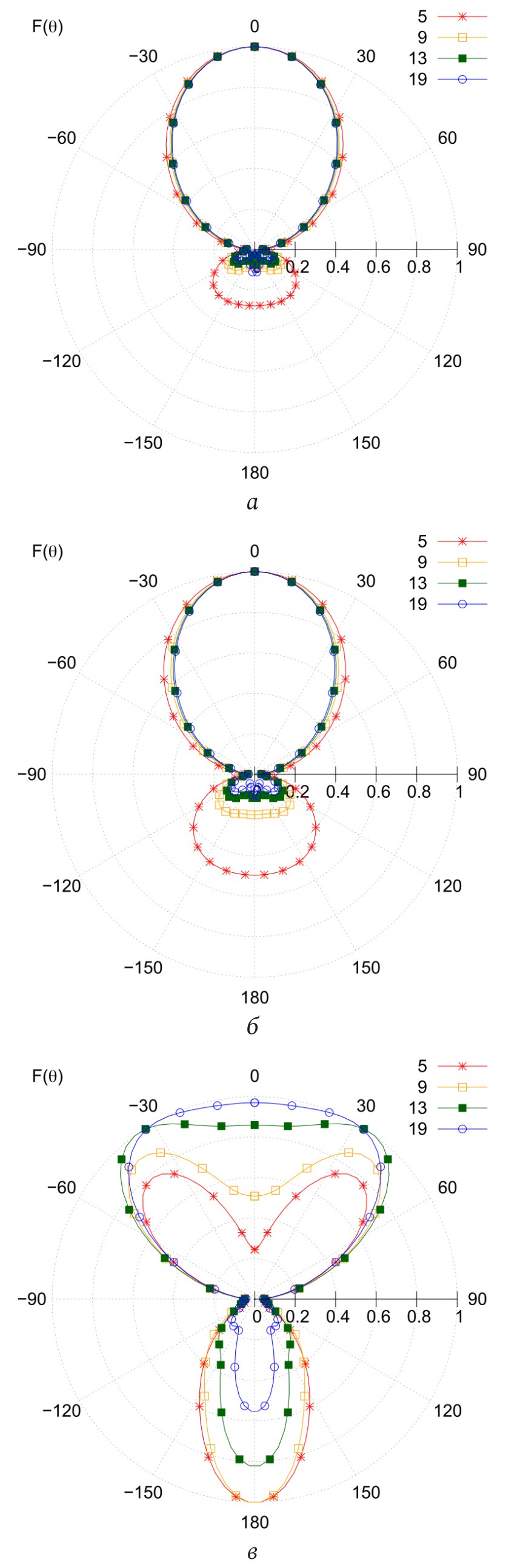 Рис. 9. Сравнение нормированных амплитудных меридианных ДН для (а), (б) и (в), рассчитанных для различного числа элементов рефлектора (указаны в обозначении кривых)