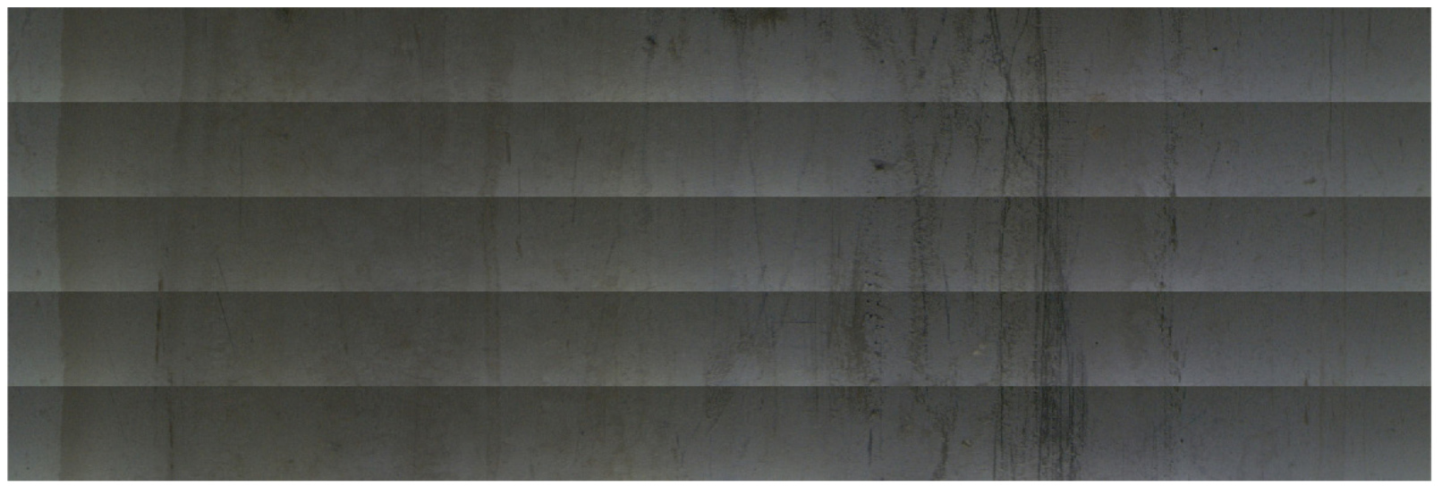 Рис. 3. Пять кадров цилиндрической панорамы внутренней поверхности трубы, подлежащие сшивке