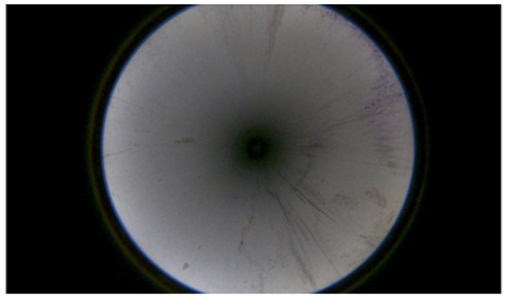 Практическая реализация рассмотренного алгоритма показывает, что принятые решения позволяют обеспечить высокое качество изображения полной панорамы внутренней поверхности труб. Пример панорамного изображения для трубы с внутренним диаметром 50 мм показан на рис. 12. Оно состоит из 100 сшитых кадров и имеет размер 3487 × 11849 px. Такое изображение можно использовать как «паспорт качества» трубы.
