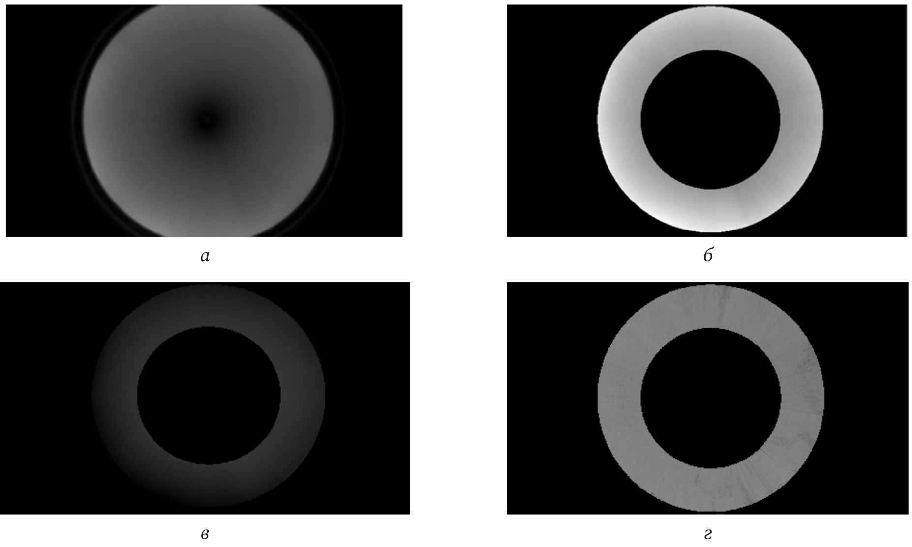 - Из усредненной яркостной компоненты вырезается кольцевая область, которая будет использоваться для формирования цилиндрической панорамы (рис. 5, б), и из нее путем привязки минимального значения яркости к нулю и инверсии формируется матрица коррекции (рис. 5, в).