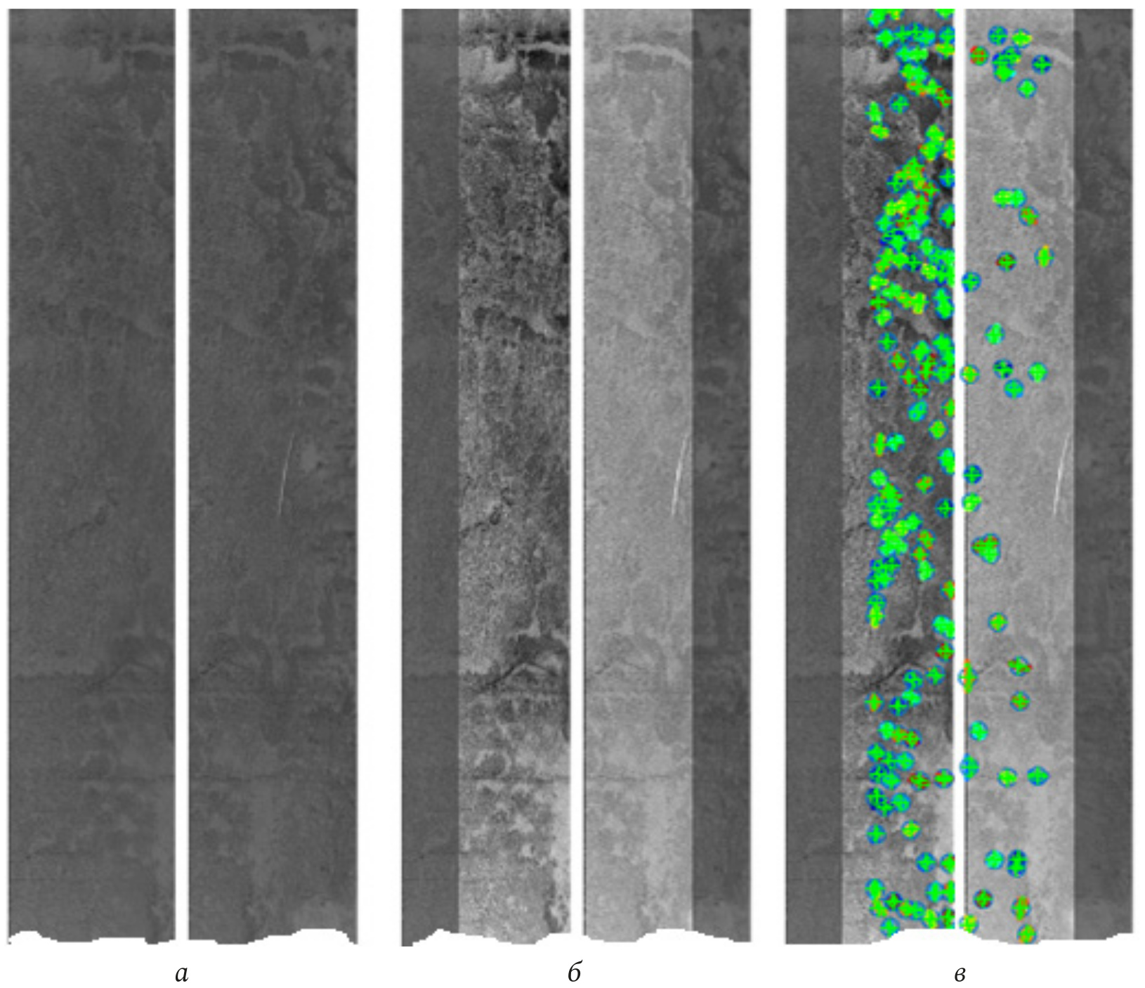 Рис. 7. Иллюстрация процесса сшивки двух соседних кадров: а – два соседних кадра формируемой панорамы; б – два соседних кадра после контрастирования в областях перекрытия; в – два соседних кадра с обнаруженными регионами MSER