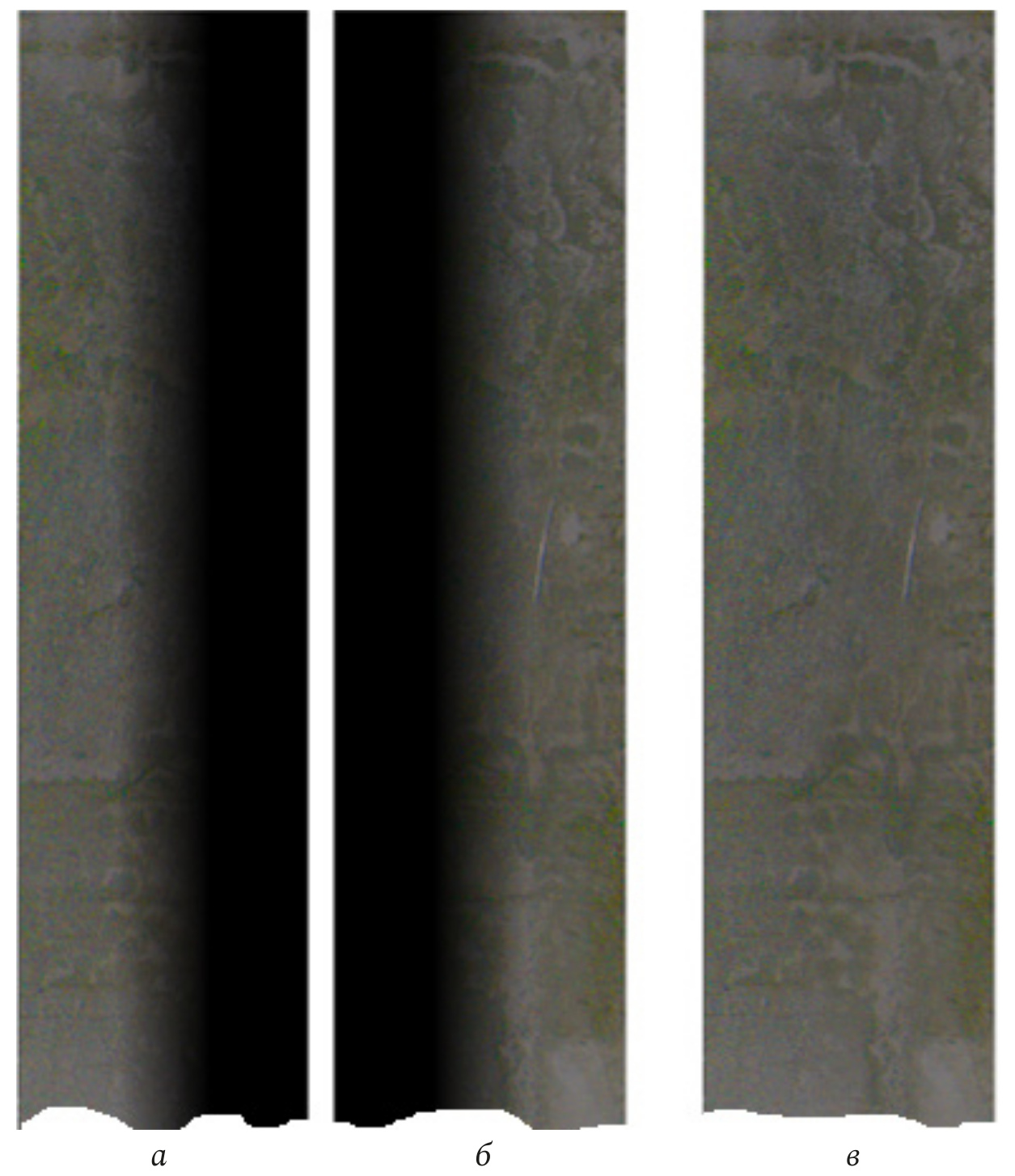 Задача компенсации вариаций яркости и контраста изображений по полю порождена особенностями оптической системы, которая приводит к снижению освещенности на краях поля изображения, и неравномерностью освещенности на внутренней поверхности трубы, создаваемой светодиодным осветителем. Наличие вариаций яркости и контраста ведет к сильному ухудшению качества сшитого панорамного изображения. Это иллюстрируется рис. 3, на котором представлены пять кадров цилиндрической панорамы, подлежащие сшивке. Анализ показывает, что использование таких изображений приводит к неприемлемой заметности сшивки.