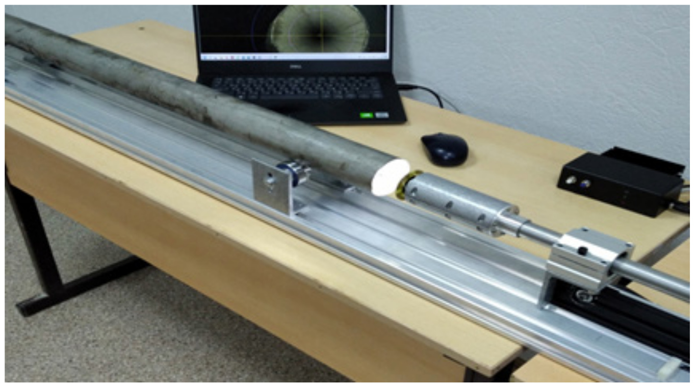 Экспериментальные исследования предлагаемого алгоритма выполнялись на макете аппаратно-программного комплекса телевизионного контроля внутренней поверхности труб, созданного с участием автора [8; 9]. В аппаратную часть комплекса входят: высокоскоростная IP-видеокамера со сверхширокоугольным объективом типа Fisheye с угловым полем 180 градусов; светодиодный осветитель, размещенный на камере и блок линейного перемещения камеры внутри трубы. В качестве камеры используется видеокамера для машинного зрения Basler a2F1920-51gmBAS с интерфейсом GigE, CMOS-матрицей IMX392. Камера формирует изображения с максимальной частотой 51 кадр/с с числом элементов 2,3 Мpx.