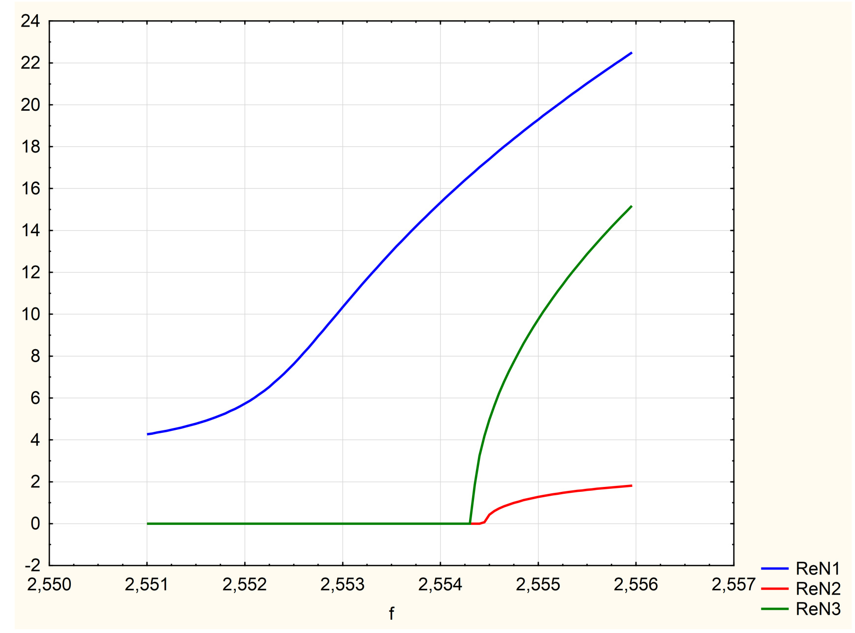 На рис. 1–2 показаны частотные зависимости действительных и мнимых частей величин Ni, которые определяются как относительные значения z-компонент волновых векторов нормальных световых волн в среде с пространственной дисперсией:
