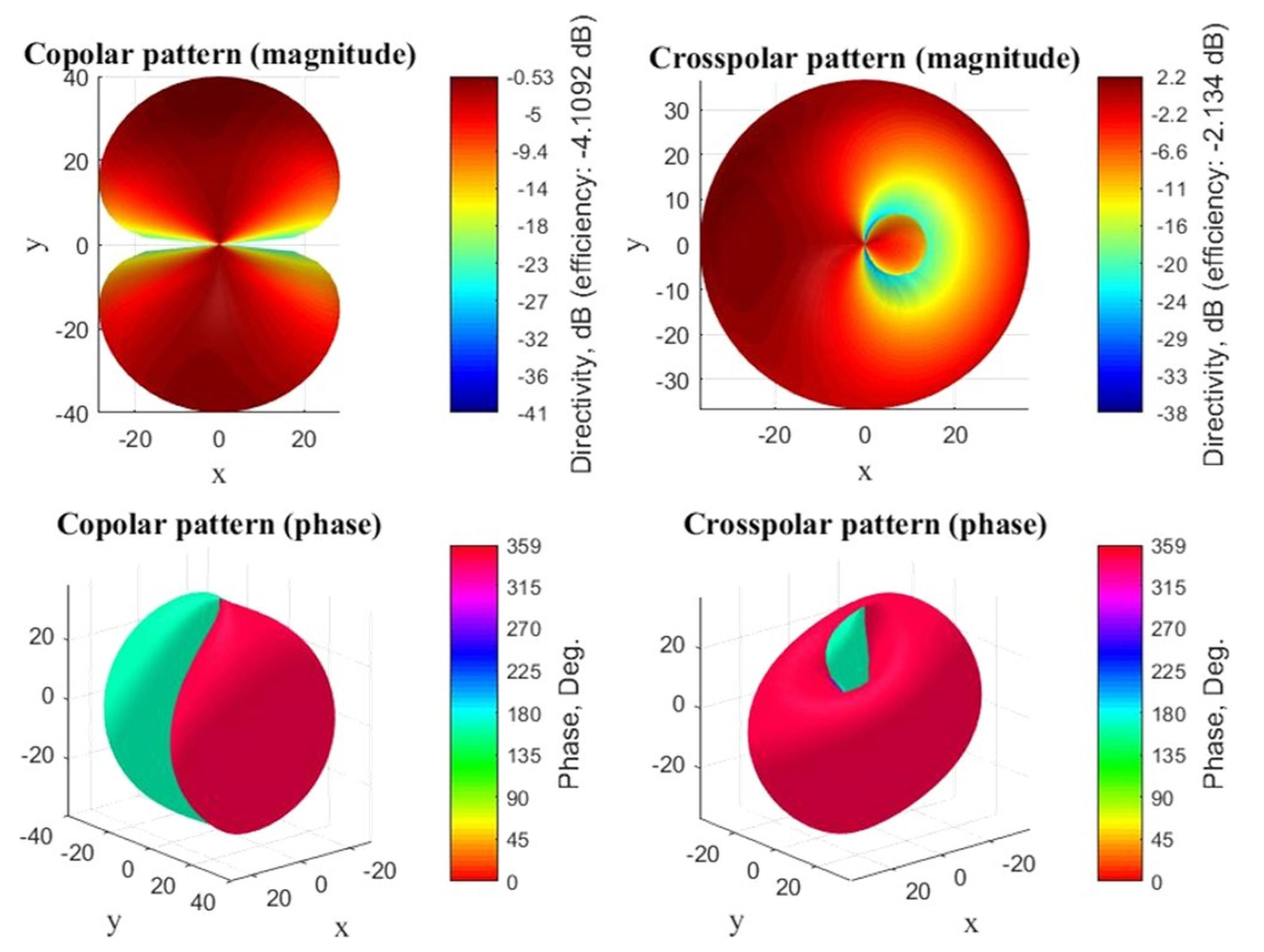 Идеальная ДН номер 1 (то есть ДН изолированного 1-го АЭ, расположенного в начале координат) представлена на рис. 2, где для наглядности приведены трехмерные графики (в сферических координатах) как амплитудной, так и фазовой зависимостей. По формулам сдвига (5)–(6) из этой ДН можно получить идеальные ДН 2-го и 3-го АЭ, идентичных с первым, но размещенных, соответственно, в точках (40 мм; 0; 0) и (40 мм; 0; −40 мм). Максимумы амплитуды ДН на кополярной и кроссполярной компонентах равны −0,534 дБи и 2,245 дБи (имеются в виду модули величин и соответствующих базисным векторам и как указано в (1)–(2)). Максимальное же значение амплитуды векторной ДН
