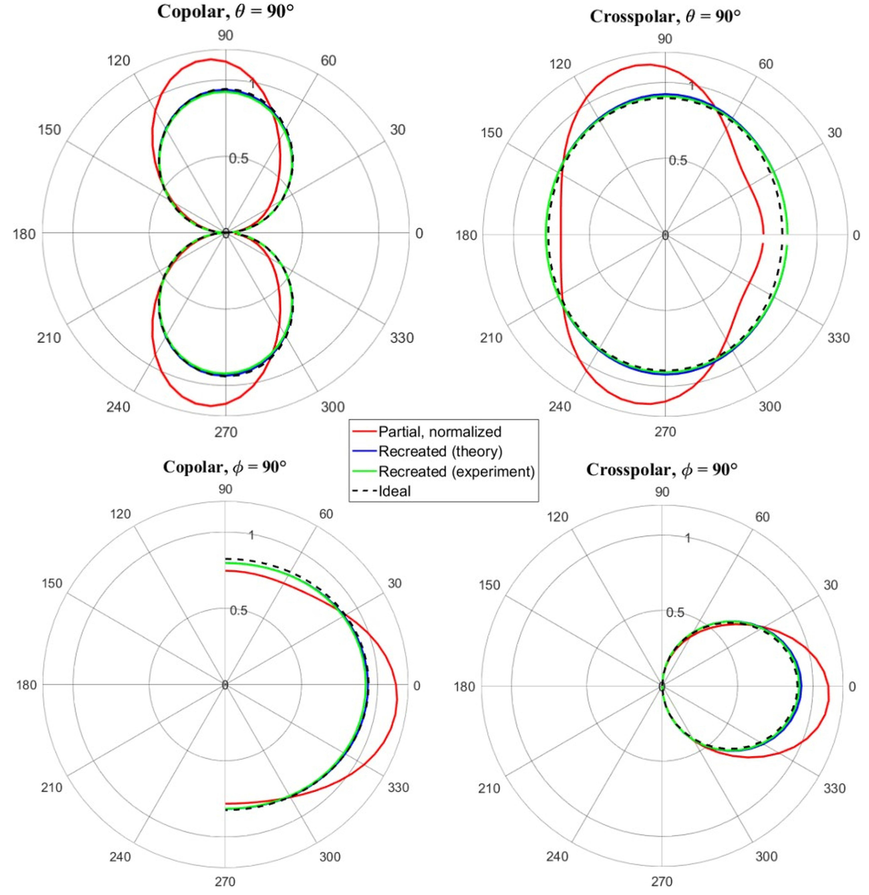 Подача скорректированных таким образом сигналов на входы реальной АР приводит к формированию характеристики направленности, с хорошей точностью воссоздающей идеальную ДН 1-го АЭ. На рис. 4 показаны графики двумерных сечений диаграмм направленности в полярных координатах, позволяющие сравнить парциальную ДН 1-го АЭ, воссоздающую ее характеристику направленности АР – как рассчитанную теоретически, так и полученную посредством моделирования в CST Studio Suite, – а также исходную (идеальную) ДН 1-го АЭ.