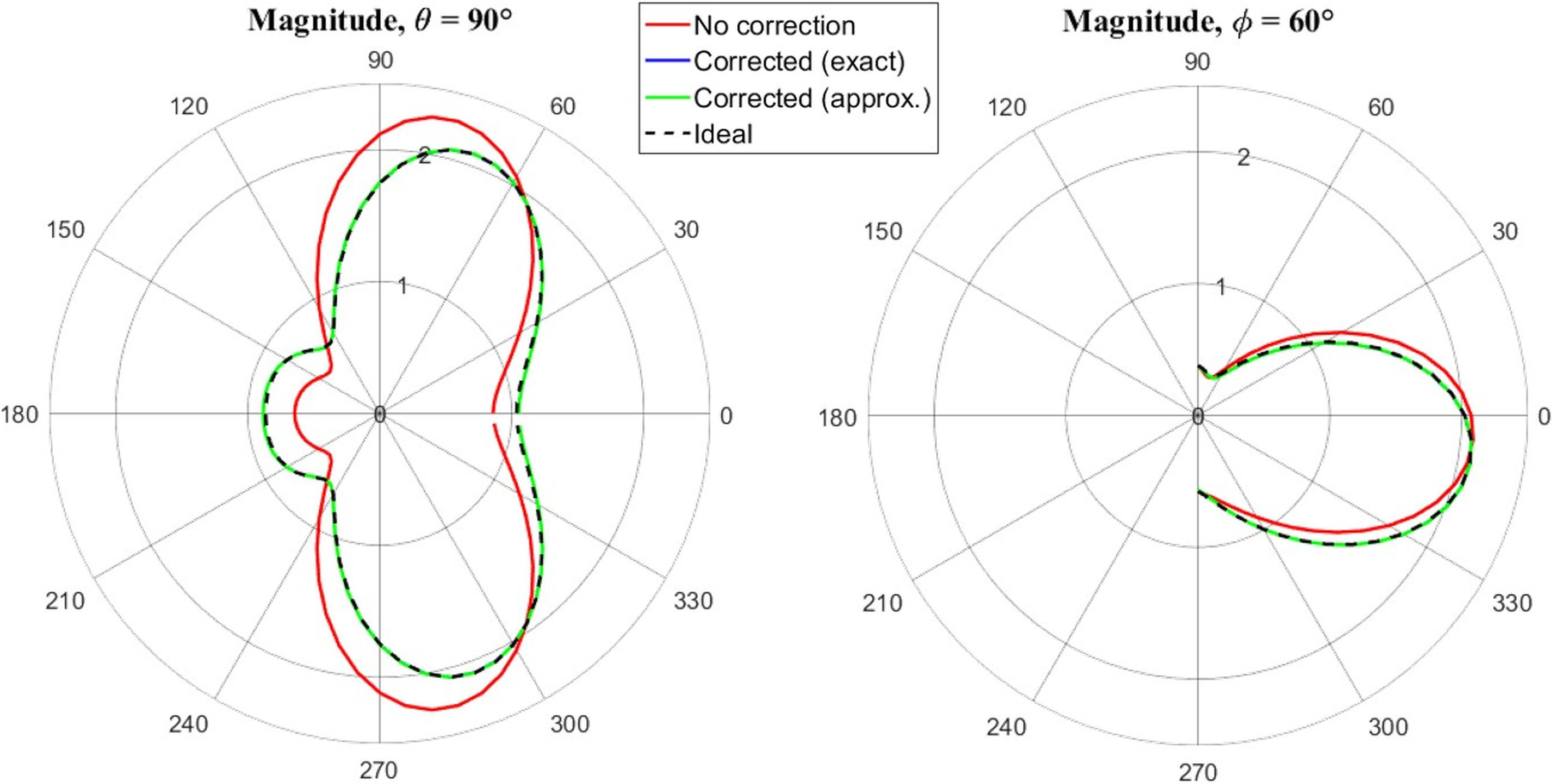 Можно заметить, что в результате обеих версий коррекции характеристика направленности практически совпала с достигаемой в идеальной АР. В том числе направление максимума сместилось с и до значений и (практически совпадающих для точной и приближенной версий, а также для направления максимума, которое может быть достигнуто в идеальной АР с классической фазировкой (17)).