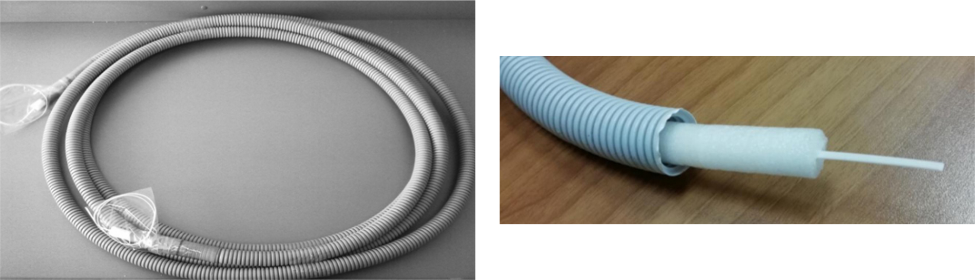 Вариантом волноводной линии 3-мм диапазона длин волн является ДВ, представляющий собой полотно из фторопласта сечением 2,2 × 1 мм2 в пенополиэтиленовой оболочке, помещенной во внешнюю гофрированную оболочку из ПВХ (рис. 3). Указанный размер сечения ДВ обеспечивает одномодовый режим распространения основной волны НЕ11 и погонные потери не более 2 дБ/м, что допускает использование волновода длиной до 10 м. При этом допустимы радиусы изгибов волноводов не менее практически без изменения фазового набега.