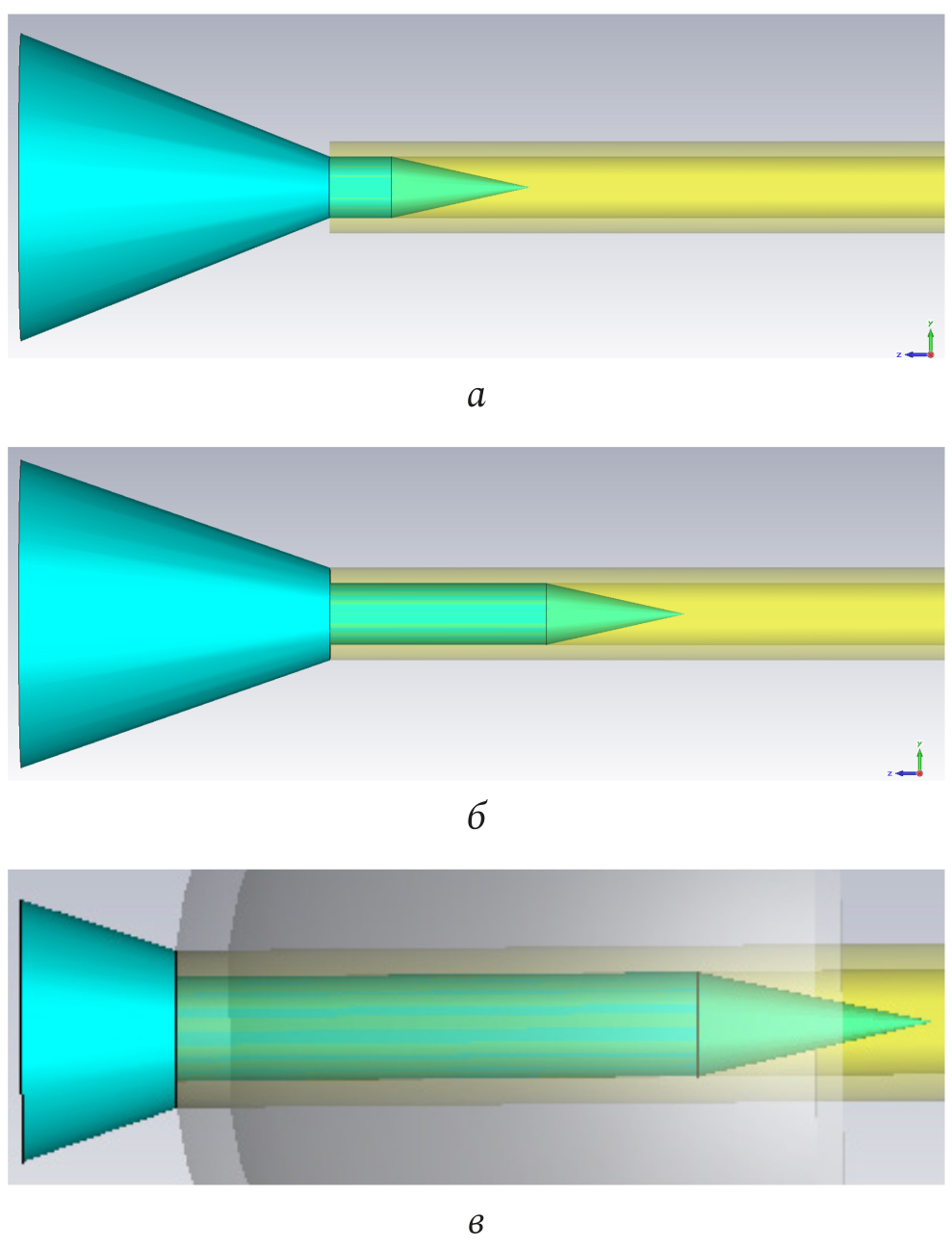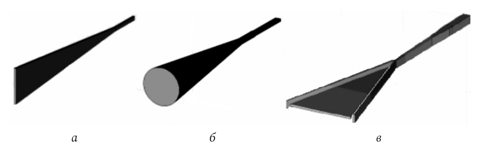 Рис. 5. Конструкции конического (б) и планарных излучателей (а, в)
