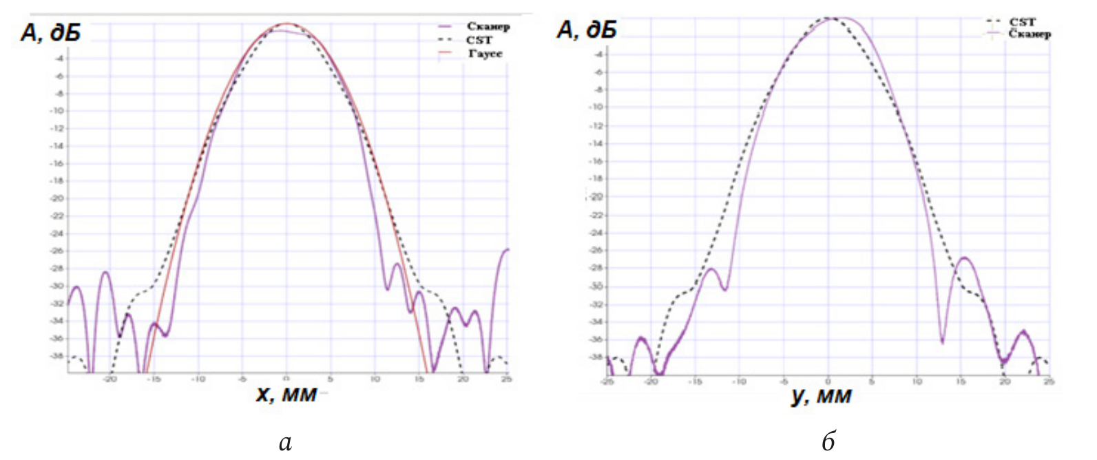 Рис. 6. Амплитудные распределения составляющей поля Еy конусного излучателя на расстоянии 10 мм (а – в Н-плоскости; б – в Е-плоскости)