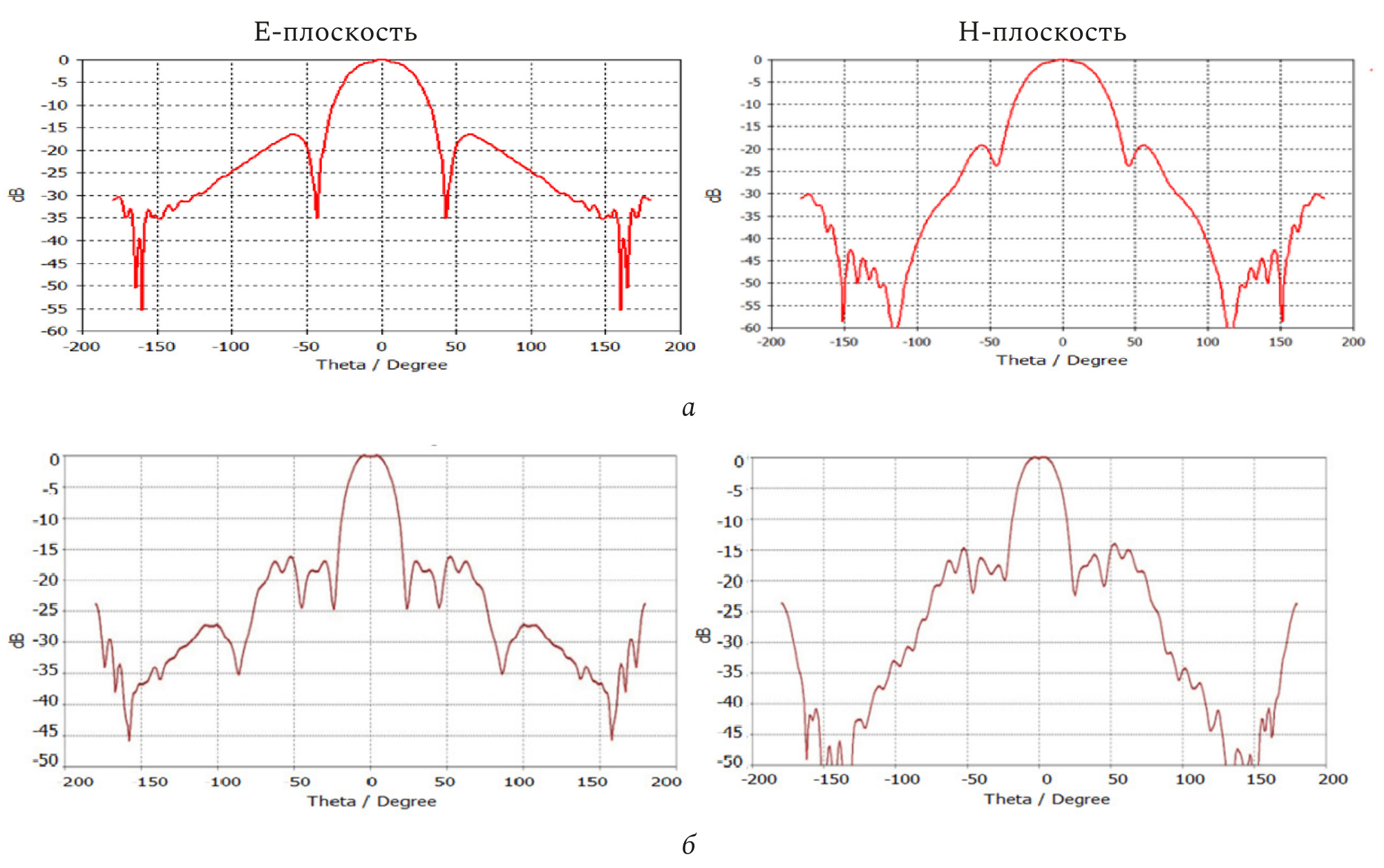 Из представленных зависимостей АР видно, что для конусных излучателей (рис. 6) характерно наличие боковых экстремумов на уровне минус 15...20 дБ. Тем не менее клиновидные излучатели могут быть использованы в одноканальных РИ при условии задания поперечных размеров области облучения ОД, не превышающих ширину АФР по уровню ниже минус 30 дБ.