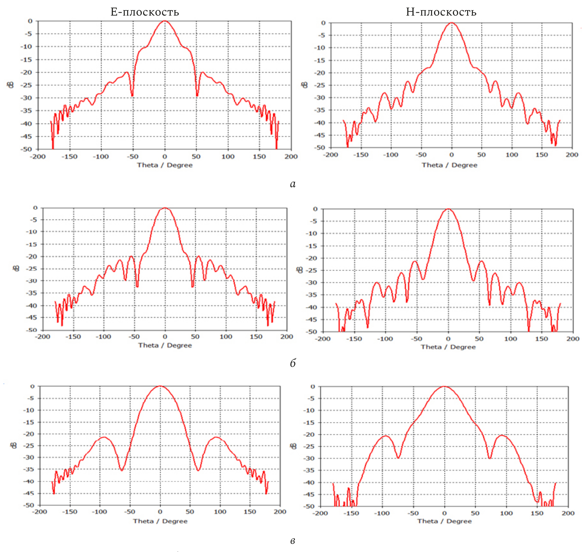 Рис. 14. Диаграммы направленности, формируемые коническим излучателем из полистирола, представленным на: а – рис. 13, а; б – рис. 13, б; в – рис. 13, в
