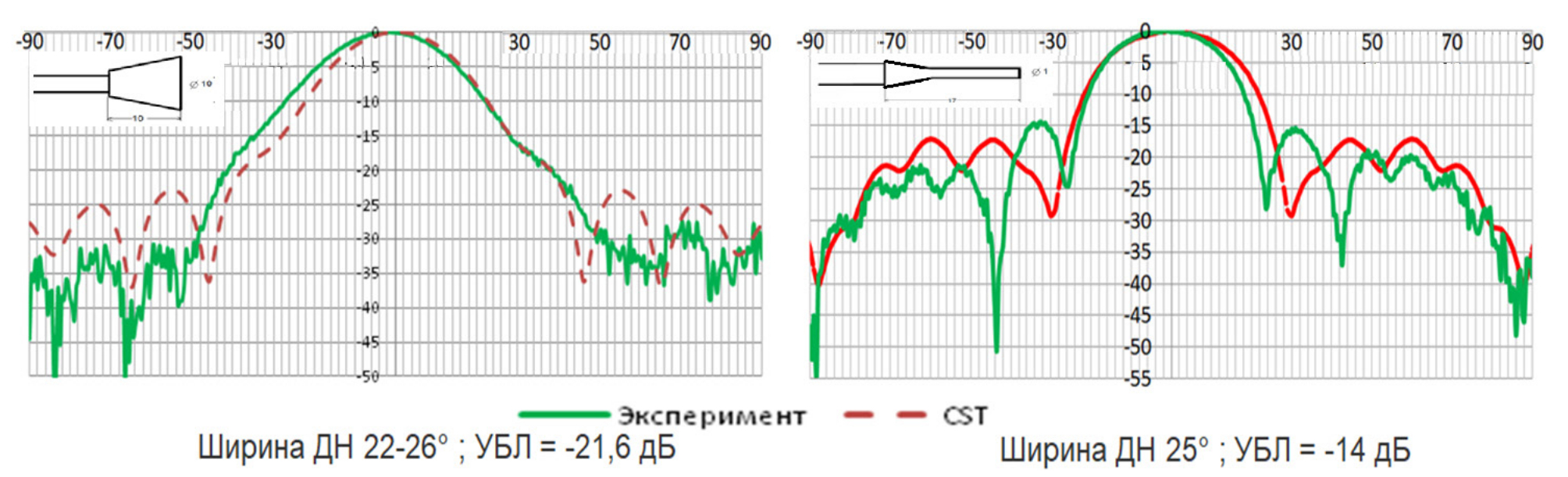 Ниже представлены некоторые результаты численного моделирования в CST MWS и экспериментальных исследований на метрологически аттестованном стенде НИИИС конструкций излучателей, приведенных на рис. 5.
