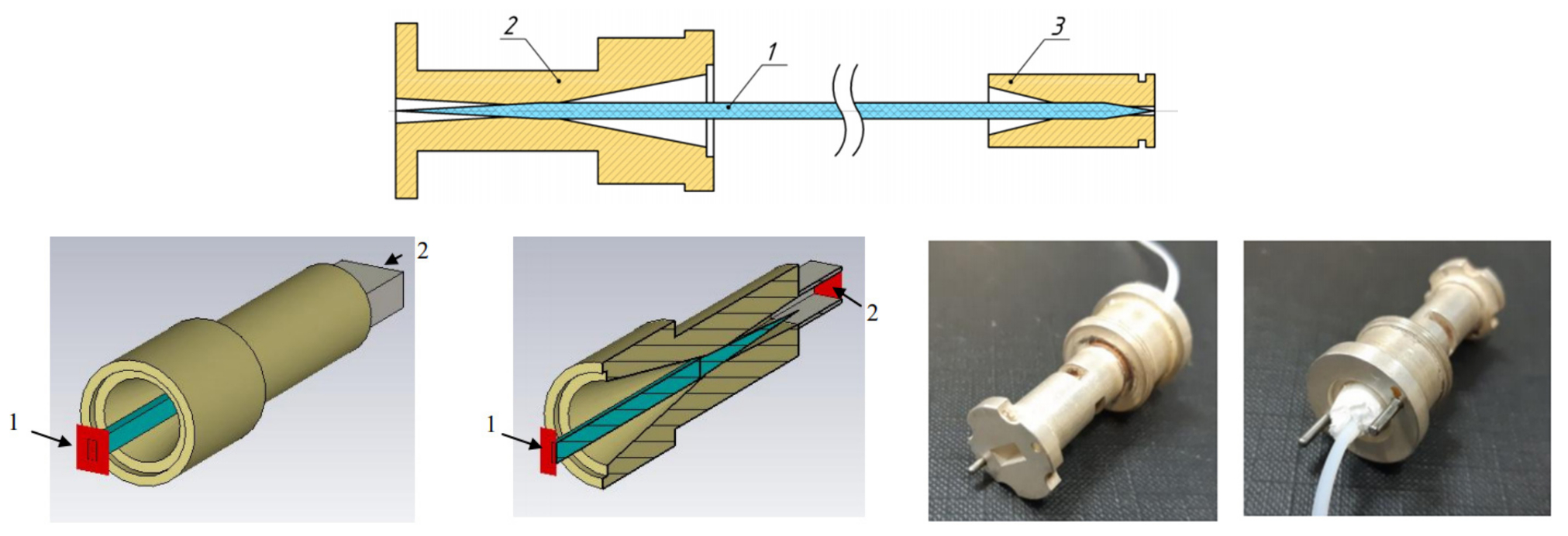 Для использования описанного ДВ в составе линии передачи (ЛП) в тракте РИ его необходимо согласовать с приемным входом. Для этого можно использовать плавные волноводные переходы с ДВ на прямоугольный МВ стандартного сечения 2,4 × 1,2 мм2 [5].