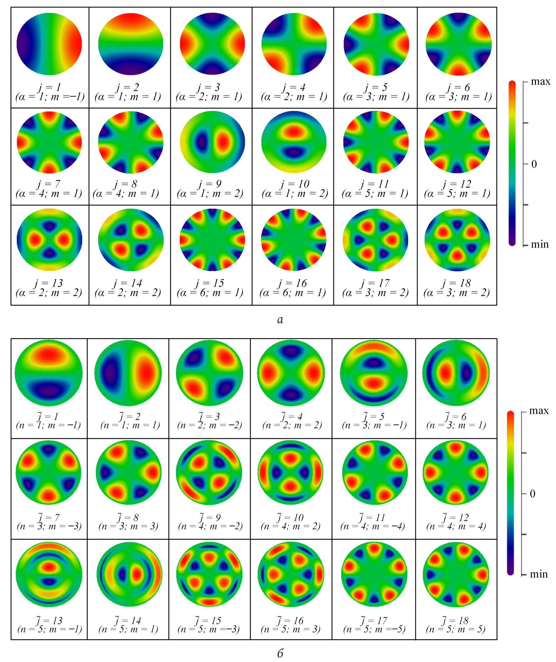 В качестве и предлагается применять двумерные модифицированные функции Бесселя первого рода действительного переменного и многочлены Цернике удовлетворяющие условиям (6) и (7) соответственно.