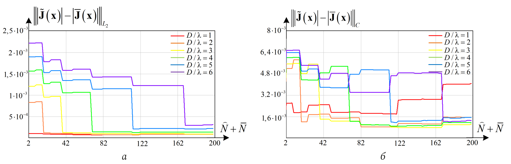 Для наглядной демонстрации предпочтительности сформированного решения выполним серию вычислительных экспериментов, которые предполагают получение плотности тока на освещенной и теневой сторонах диска для различных порядков аппроксимации полиномов и размеров диска, заданного соотношением , – длина волны.