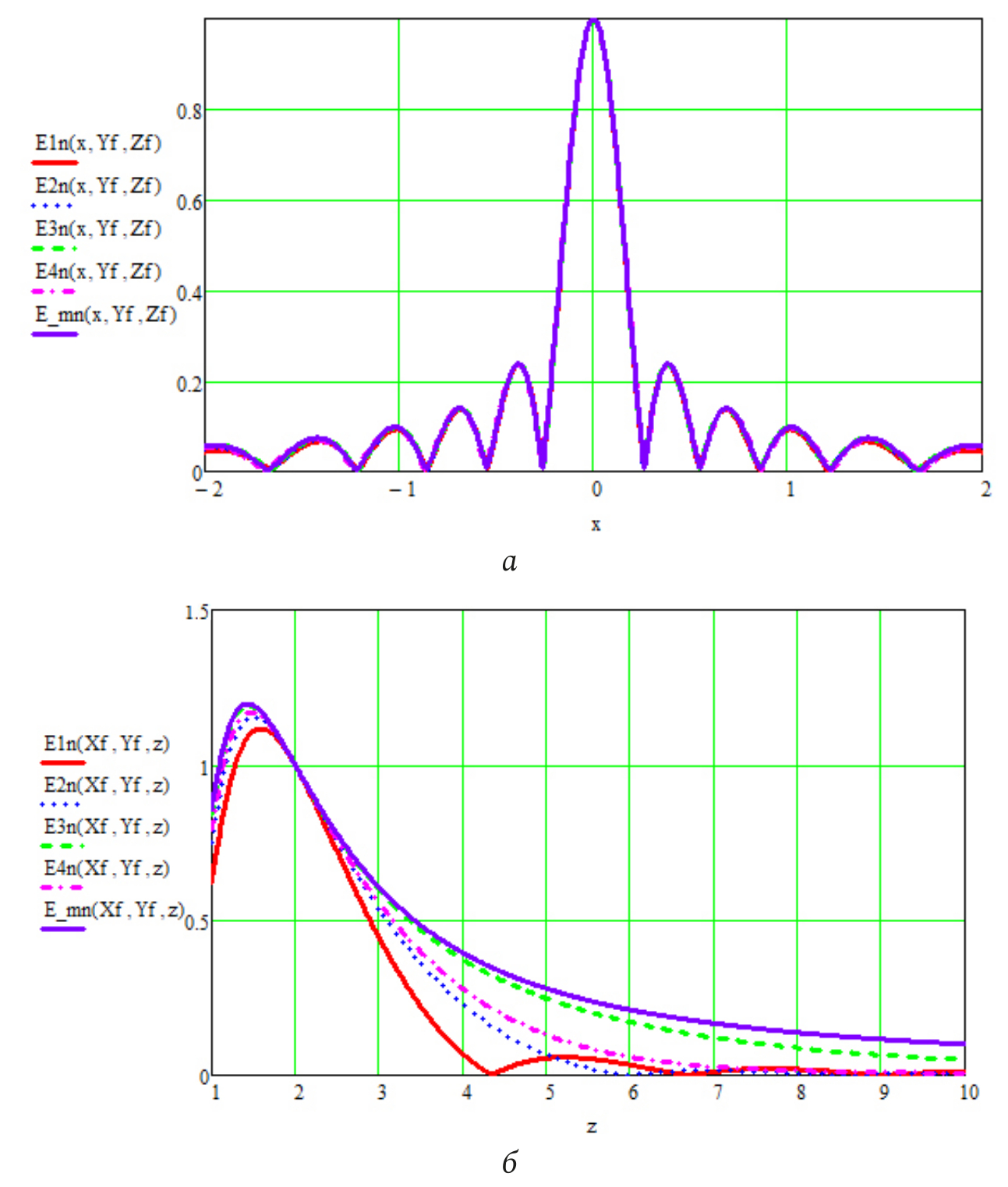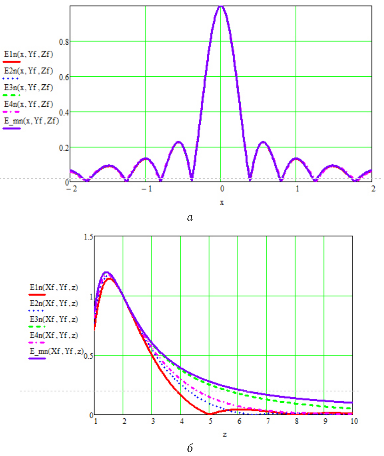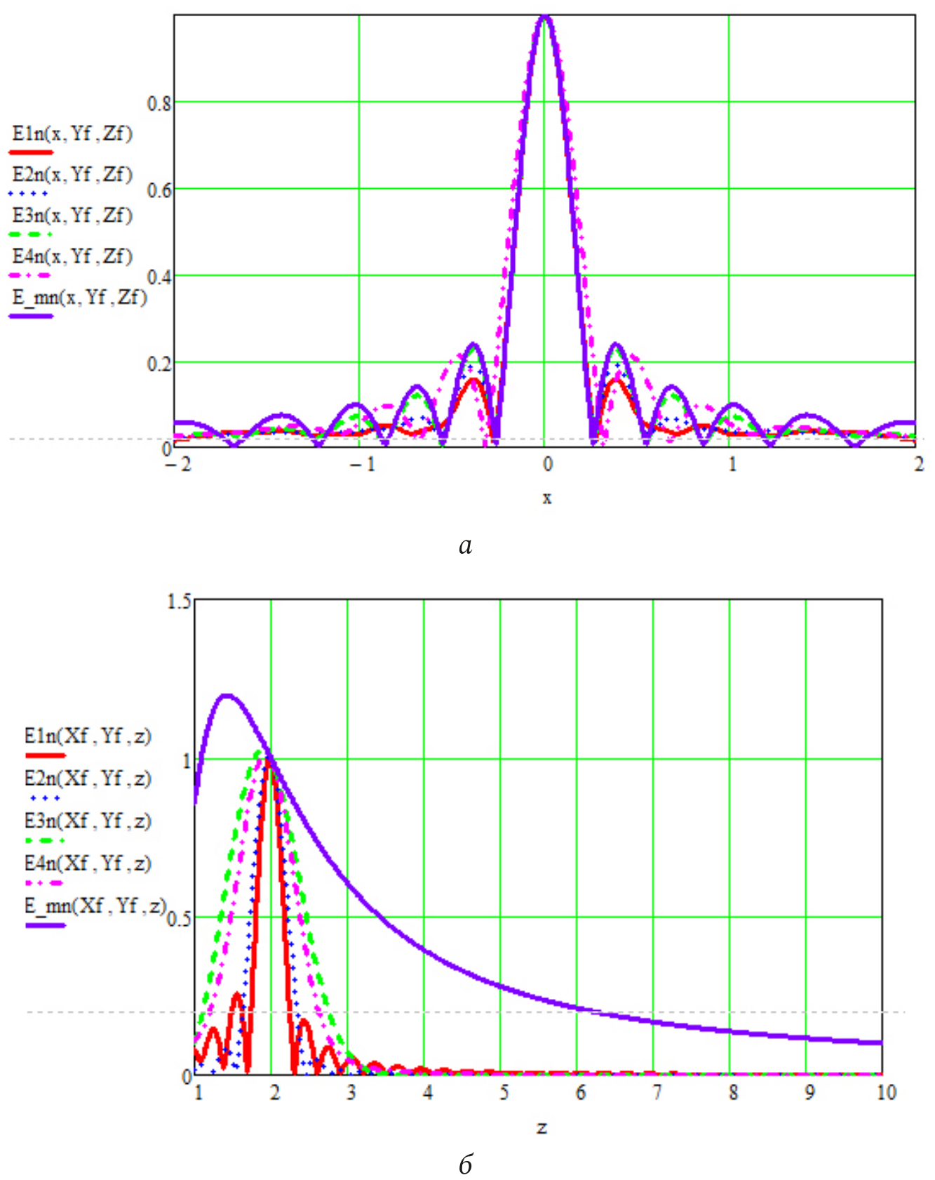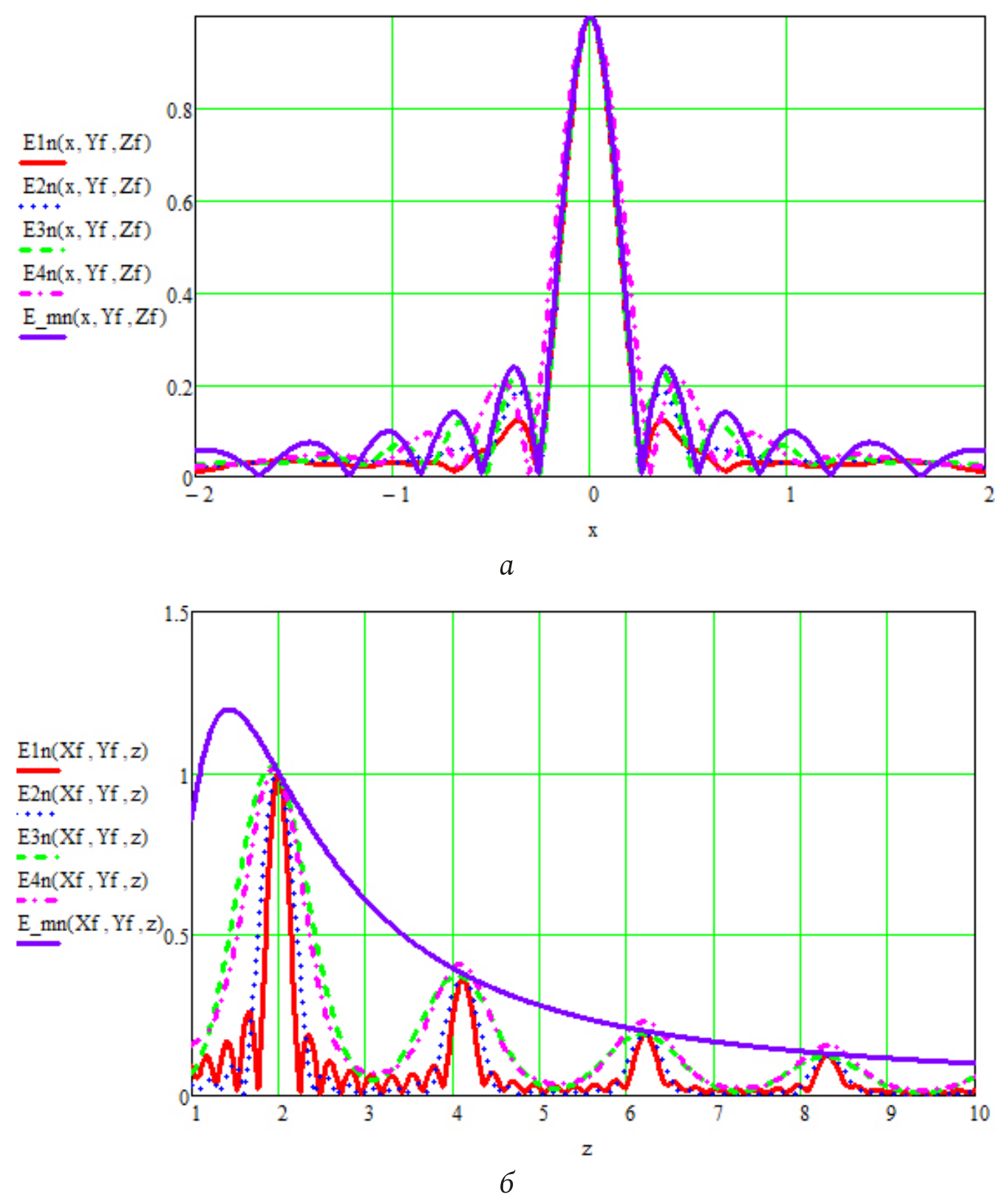 Рис. 8. Нормированные значения модуля напряженности электрического поля для сигналов с различными видами дискретного спектра шириной 1000 МГц: а – в поперечном направлении; б – в продольном направлении
