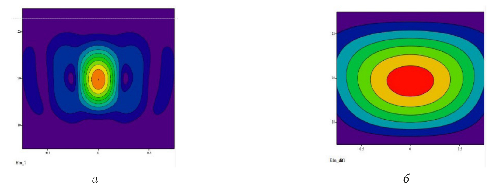 Рис. 9. Пространственные распределения модуля напряженности электрического поля в окрестности точки фокусировки: а – исходное; б – специальное, увеличенное в 8 раз