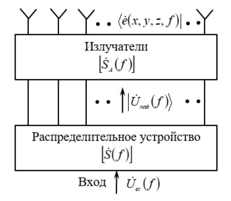 Для количественного описания основных характеристик антенных решеток предложены и апробированы матричные модели с поэлементным учетом эффектов взаимной связи излучателей антенной решетки. Рассмотрим антенную решетку в виде соединения конечного числа излучателей и распределительного устройства, модель которой представлена на рис. 11.