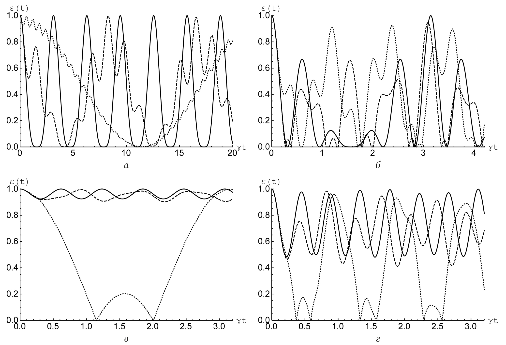 Рис. 2. Отрицательность как функция безразмерного времени для начального состояния кубитов (3) при и (а); (б), (в) и (г). Безразмерная константа диполь-дипольного взаимодействия (сплошная линия), (штриховая линия) и (точечная линия)