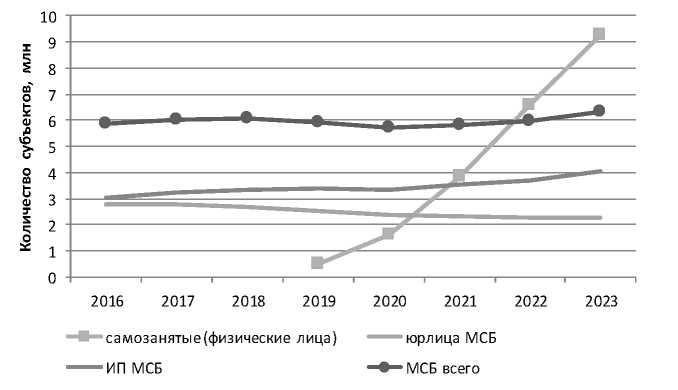 Исходя из того, что рост ВВП в 2023 г. составил (по предварительным данным) 3,6% и доля МСБ в ВВП относительно постоянна (рис. 1), а также учитывая общий возрастающий тренд числа субъектов МСБ (рис. 2), можно ожидать дальнейший рост этого сектора.