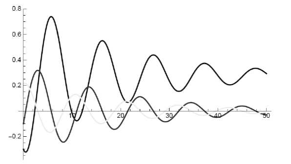 Поведение рынка денег и долга во времени задается осцилляциями индексов и , где абсолютная величина амплитуды характеризует максимальное уклонение долга (или денег) от состояния равновесия. Динамика этих индексов удовлетворяет условиям стационарности[6], что видно, например, на рис. 5, где случайная динамика индекса долга смоделирована программой Mathematica 10, составленной системой ИИ [AI LMSYS, 2024].