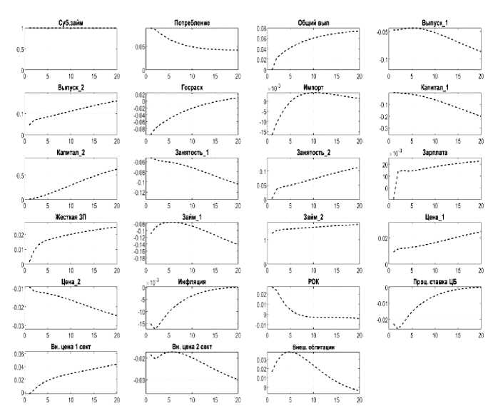 Дополнительно отмечено, что динамика перехода к равновесию после шока репрессии довольно длительная. В частности, подстройка к новому положению равновесия, несмотря на то что шок льготного кредитования случается лишь в первый момент времени, занимает более 20 кварталов. Это связано с неоптимальностью быстрой подстройки других переменных в связи с наличием издержек на изменение цен, заработных плат, инвестиций.