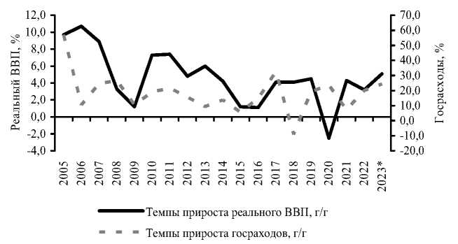 Можно также заметить, что государственные расходы подвержены более высокой волатильности в ответ на отрицательный шок цены на нефть в модели с льготным кредитованием по сравнению с моделью без льготного кредитования. Это объясняется тем, что государство в модели с репрессией в рамках заданного выражения (45) несет дополнительные расходы на предоставление льготных займов, связанные с процентными выплатами, которые финансируются, как было отмечено ранее, отчасти за счет сокращения государственного потребления. Ввиду выражения (45) в модели с репрессией помимо волатильности наблюдается и более резкая реакция самого отклика государственных расходов в ответ на шок цен на нефть: государственные расходы снижаются на 0,96 п.п. в модели с репрессией против 0,57 в модели без репрессии. Такая процикличность бюджетной политики действительно характерна для экономики Казахстана за больший период наблюдения с 2005 по 2023 гг. (см. рис. 3).