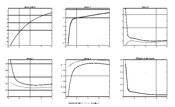 Как видно из рис. П1, отклики кредитов производителей промежуточных товаров 1 и 2 при > 0 при наличии репрессии и внешнем шоке цены на нефть смотрят в одну сторону в случае смягчения условия дивидендной политики: реакция переменной «займ 2» изменила направление. Это означает, что в случае кризиса (отрицательного шока цены на нефть) и при нарушении трансляции интересов собственников производители второго типа даже при наличии доступа к кредитам по сниженной процентной ставке снижают спрос на заемные средства так же, как и производители первого типа. Однако несмотря на то, что реакция переменной «займ 2» в ответ на нефтяной шок при условии > 0 изменилась, общая инфляция реагирует аналогично тому, как реагировала в условиях = 0. Следовательно, отличие в реакции кредитов – это отдельный эффект, который не влияет на реакцию инфляции. Иными словами, общие результаты модели устойчивы к изменению условия трансляции производителями промежуточных товаров интересов собственников. Поэтому в самой работе анализ продолжен для модели с условием = 0.