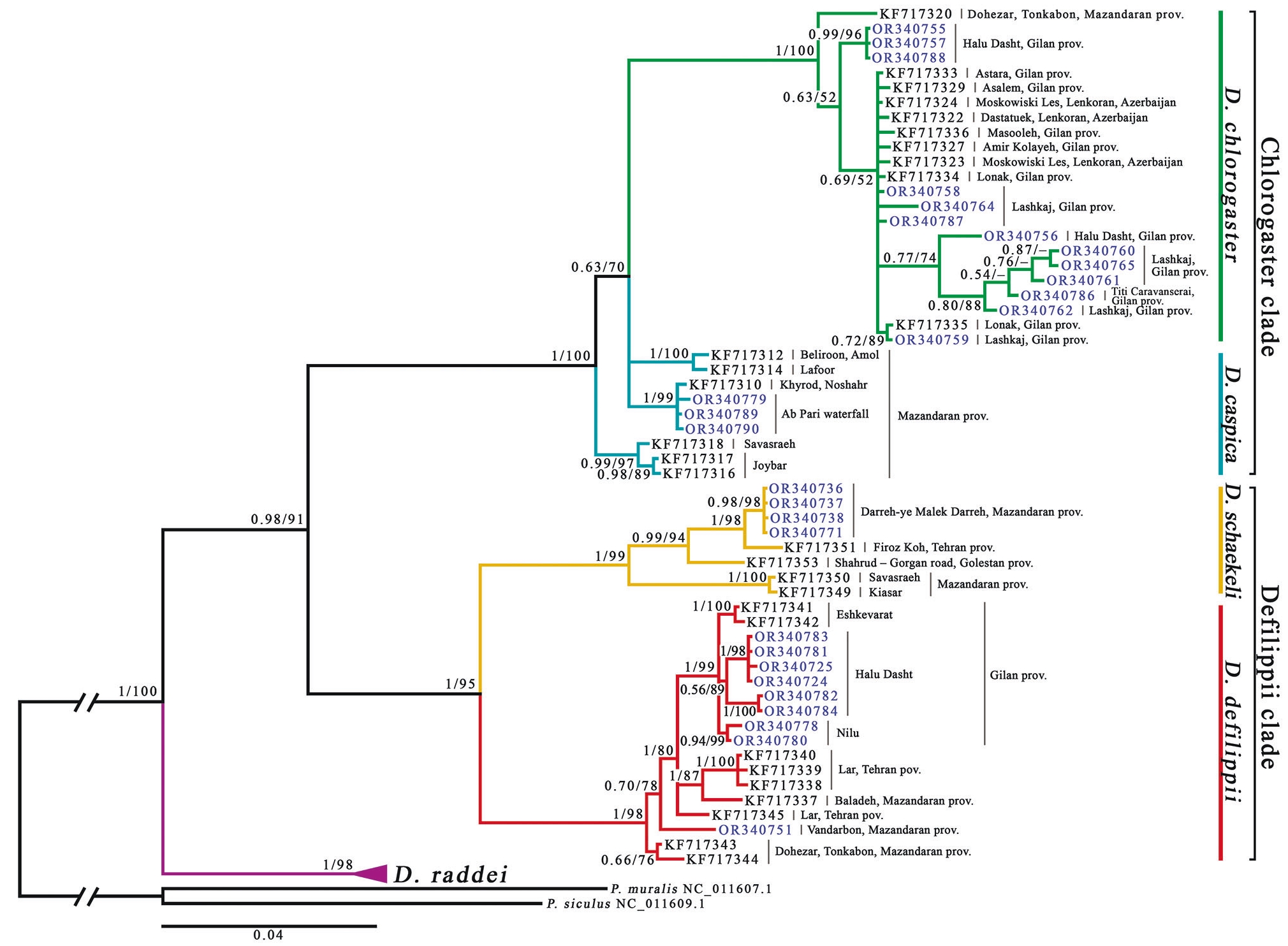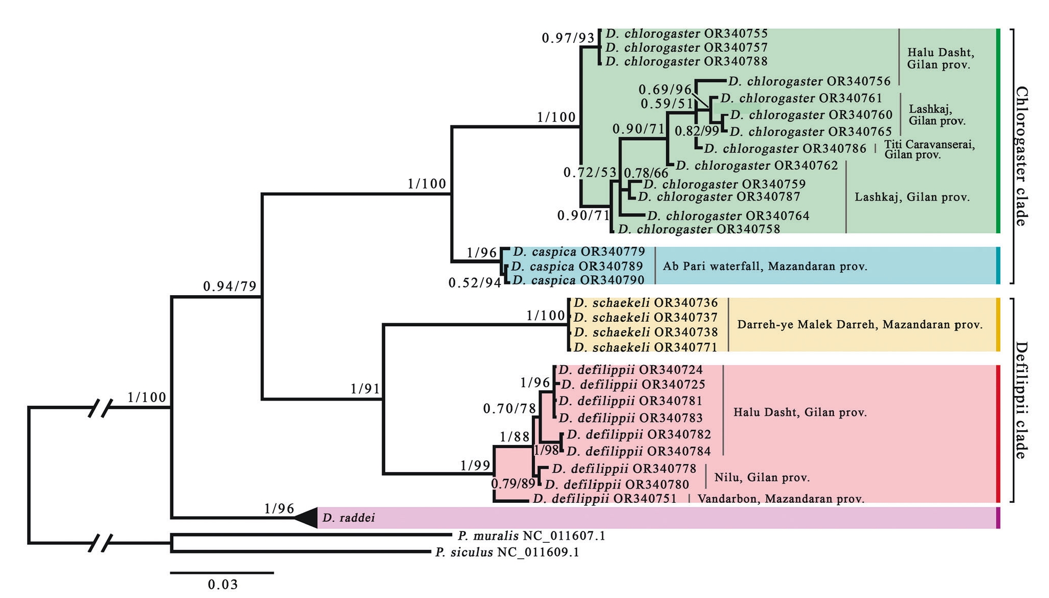 With the addition of sequences from hmadzadeh et al. (2013) the topology of the tree changed (Fig. 2). Relationships between main clades and between D. defilippii and D. schaekeli are resolved with a high support unlike the first tree, that contains only our sequences (Fig. 1). D. caspica is not monophyletic, it splits into three separate clusters. One cluster has high support, while two others form a trichotomy with D. chlorogaster within a lowsupported group (0.63/70). D. schaekeli specimens with high levels of support are divided according to localities from different provinces. Localities from Mazandaran province are divided separately – with individuals caught by us in Darreh-ye Malek Darreh and individuals from GenBank from Savasraeh (KF717317) and Kiasar (KF717316) which are the most distant from the others. D. defilippii specimens form a clade with trichotomy divided by localities Eshkevarat, Halu Dasht, and Nilu villages from Gilan province. Phylogenetic distribution of D. defilippii by localities has not been confirmed: nodes do not form distinct clusters and nodes supports are low. Phylogenetic relationships within D. chlorogaster still remain unclear: individual clusters by locality have not been formed, almost all nodes have low support, and many of them are unresolved. However, the most distant specimen within D. chlorogaster clade is from Dohezar, Mazandaran province (KF717320), and it is significantly divided from others.
