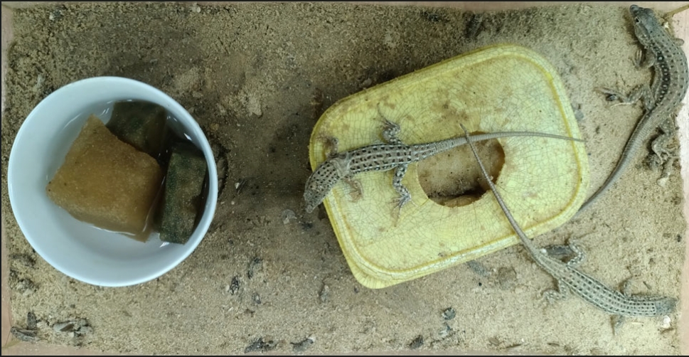 В работе были задействованы взрослые животные (2 самки и 2 самца), отловленные во II декаде апреля 2019 г. в окрестностях г. Бохтар (= Курган-Тюбе) Хатлонской области Республики Таджикистан и полученное от них потомство в искусственных условиях в том же году (3 самки и 2 самца). Животных содержали группами в стеклянных террариумах размером46×21×33 смс субстратомиз промытого речного песка слоем 2 – 3 см. В террариуме размещали поилку и убежище (наполненный влажным паролоном пластиковый контейнер с прорезанным в крышке отверстием) (рис. 1). Локальный обогрев дна осуществляли нагревательным кабелем Repti Zoo RS7050 (Repti Zoo, КНР) мощностью 80 Вт, а освещение – люминесцентными лампами Sylvania Reptistar T8 (Sylvania, Германия) мощностью 30 Вт в течение 12 ч в сутки. За 2 недели до зимовки длительность обогрева и освещения сокращали до6чв сутки. Зимнее охлаждение ящериц из природы в 2019 – 2020 гг. проводили в течение 67 суток при температуре 13 – 20°C, а в 2020 – 2021 гг. – 65 суток при температуре 15 – 21°C. Животных, рожденных в лабораторных условиях, зимнему охлаждению не подвергали.