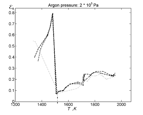 Согласно предложенной интерпретации результатов эксперимента T0 соответствует температуре насыщения поверхностного слоя образца примесными атомами O и C. При T1 происходит плавление эвтектики α-Ta + α-Ta2O5, что делает возможным растворение в ней примесных атомов и возникновение изотермического горения с образованием газообразных оксидов углерода, которые покидают образец. На изотермию горения указывает узость зоны новой фазы на замороженном образце и неизменность спектральной температуры, зависящей от формы спектра теплового излучения. При этом активация химических источников в поверхностном слое образца в дополнение к джоулевому тепловыделению приводит к резкому увеличению спектральной плотности потока излучения, что обнаруживается методом яркостной пирометрии. Конечно, в подобной точке εs не может быть оценкой спектральной степени черноты материала (в классическом понимании), но эта особенность позволяет с помощью ЯСКИ обнаруживать временный выброс или поглощение теплоты в химических реакциях, локализованных на дефектах структуры материала.