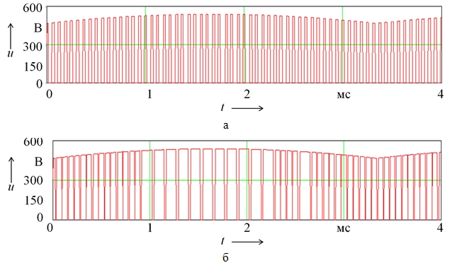 Пример расчета напряжений на выходе выпрямителей, питающих МПТ, при Uз max = 0,9Uп max приведен на рис. 2 а, расчет при Uз max = 0,5Uп max – на рис. 2 б.