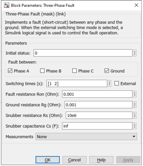 Также данный блок позволяет имитировать замыкания с переходным сопротивлением. По сути данный блок представляет из себя трехфазный блок выключателей, использующий три отдельных фазных выключателя, которые могут быть индивидуально включены/выключены для моделирования различных замыканий.