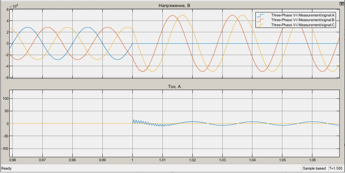 Для моделирования режима ОЗЗ выставляется время моделировании 1,5 секунды, поскольку в блоке Three – Phase Fault указан промежуток времени замыкания от 1 до 2 секунд. Если необходимо смоделировать режим работы сети на более длительном промежутке времени, то нужно увеличивать промежуток времени замыкания и увеличивать время моделирования.