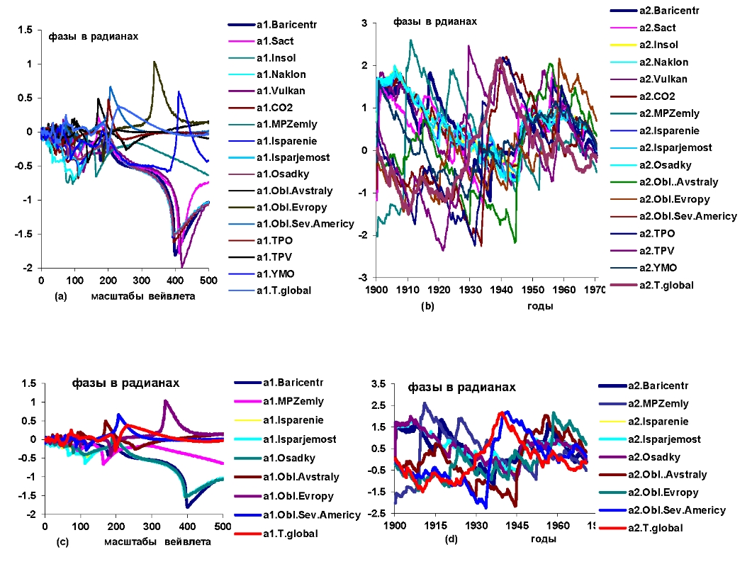 Рисунок 1 – Графики изменений: a) и b) вейвлетных фазо-частотных и фазо-временных характеристик гелиокосмических переменных (Baricentr, Sact, Insol, Naklon,Vulkan, CO2 [1, 2], магнитного роля Земли (MPZemly)); расчетных изменений динамики тепловых и водных ресурсов на территории суши [3]: испарений (Isparenie), испаряемости (Isparjaemost), осадков (Osadky); облачностей на континентах: Австралии (Obl. Avstraly), Европы (Obl. Evropy), Северной Америки (Sev. Americy) [3–8]; климатических переменных: TPV, TPV, YMO, приземной температуры (Temp.prizemn)[1]; с) и d) фазоых харатеристик: Baricentr, MPZemly, Isparenie. Isparjaemost, Osadky, Obl. Avstraly, Евроры Obl. Evropy, Sev. Americy Temp.prizemn по наблюдениям интервале времени 1900,3–1970,5 гг.