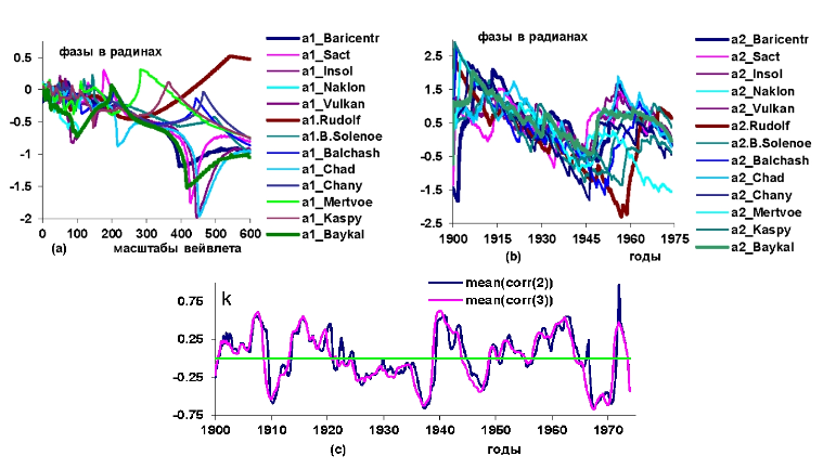 Рисунок 2 – Графики изменений: a) и b) вейвлетных фазо-частотных и фазо-временных характеристик гелиокосмических переменных (Baricentr, Sact, Insol, Naklon,Vulkan); с) усредненных фазо-временных характеристик коэффициентов корреляций k согласованных изменений фазо-временных характеристик переменных, приведенных на графиках b и испарений, испаряемости, осадков, TPV, YMO, индекса ТДО, T.global; графики получены усреднением текущих корреляций между переменными в интервалах времени 2 и 3 года (по 10 отсчетов между годами) в скользящем режиме