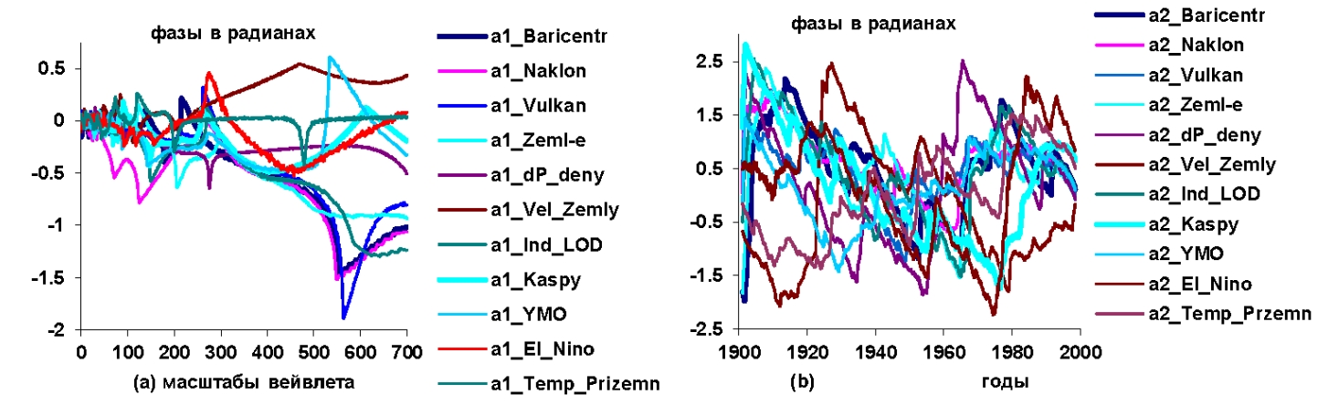 Рисунок 5 – Графики изменений вейвлетных: a) фазо-частотных и b) фазо-временных характеристик гелиокосмических: Baricentr, Naklon, Vulkan, ), землетрясений (Zeml-e), отклонений угловой скорости вращения Земли от эталонной (dP_deny), скорости вращения Земли (Vel.Zemly), скорости изменения земных суток (Ind.LOD), уровня Каспийского моря (Kaspy); уровня Мирового океана (YMO), явления Эль-Нино (El-Nino), глобальной приземной температуры (Temp.prizemn) в 1901,1–1998,6 годы