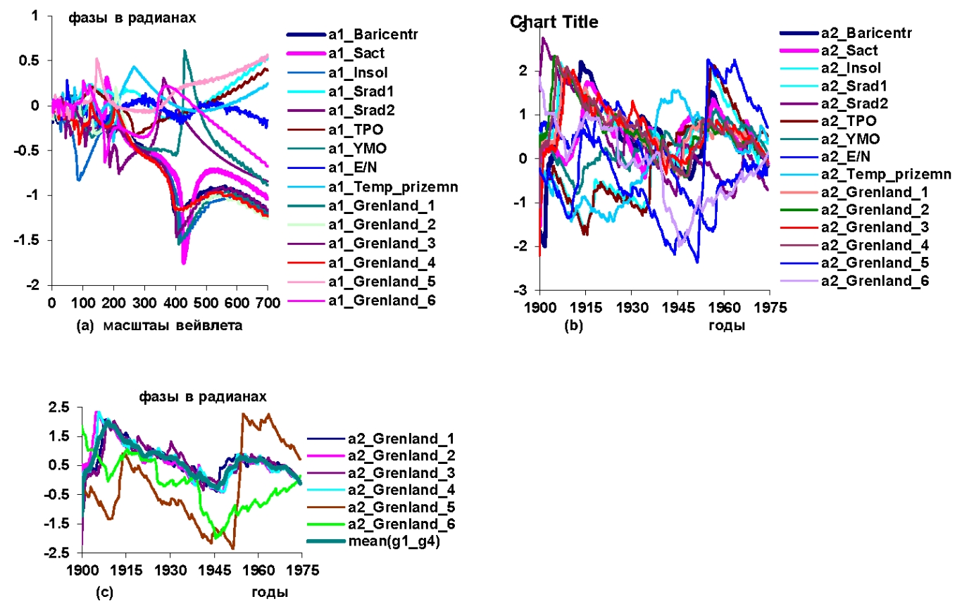 Рисунок 7 – Графики вейлетных фазо-частотных и фазо-временных характеристик: a) и b) гелиокосмических (Baricentr, Sact, Insol, Naklon, Vulkan), климатических (Srad1,Srad2,TPO, YMO, E/N), составляющих водного баланса Гренландии: а) атмосферных осадков (Grenland_1), айсбергового стока (Grenland_2), жидкого стока (Grenland_3), суммарного водно-ледникового стока (Grenland_4), результирующего водного баланса (Grenland_5), прирaщений водно-ледниковых запасов (Grenland_6); c) фазо-временных характеристик составляющих водного баланса Гренландии и усредненной кривой первых четырех переменных (mean (g1-g4)) в 1900–1974,3 гг.