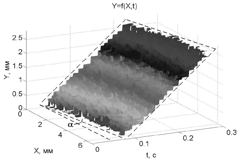 Анализ хроно-топографической карты позволяет выявить следующие закономерности. Экспериментальные данные о положении фронта СВС y=f(t,x) очень хорошо моделируются плоскостью (рис. 4). По отношению к процессу СВС это означает, что равны оценки математического ожидания скорости фронта по разным моментам времени и по различным точкам пространства. Из данного факта следует, что процесс СВ-синтеза можно считать не только стационарным, но и эргодичным. Изолиния y=const на аппроксимирующей плоскости является прямой, а угол между ее проекцией на плоскость t-X и осью X равен углу между векторами и (рис. 2, 4). Выявленные особенности процесса СВС устойчиво обнаруживались в микротепловизионных исследованиях системы Ni-Al при вариации стехиометрического состава, доли и дисперсности инертной добавки, плотности и начальной температуры шихты. По указанным причинам в основу метод ХТА легла формула: