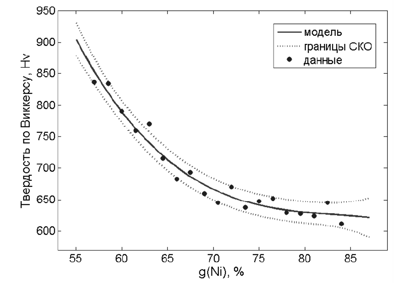 На завершающей стадии экспериментальных исследований был выполнен микродюрометрический анализ образцов, и получена зависимость средней микротвердости материала-продукта, определенная по 30 уколам индентора в произвольные области каждого образца, от массовой доли никеля (рис. 8).