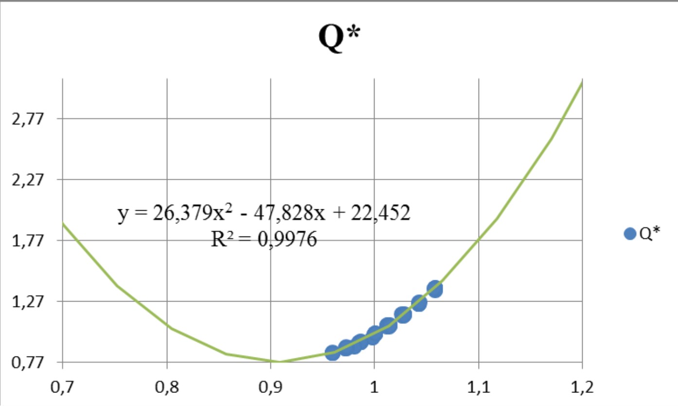 Для перевода экспериментально полученных характеристик напряжения и мощности в относительные единицы, были приняты следующие базисные величины: Uб=6002 В, Pб=2223 кВт, Qб=713 квар. Чтобы избежать возможного нарушения технологического процесса, при проведении эксперимента применялся достаточно узкий диапазон изменения напряжения (в относительных единицах от 0,972 о.е. до 1,058 о.е.). Возникла необходимость, используя методы интерполяции и экстраполяции, расширить диапазон от 0,7 о.е. до 1,2 о.е.