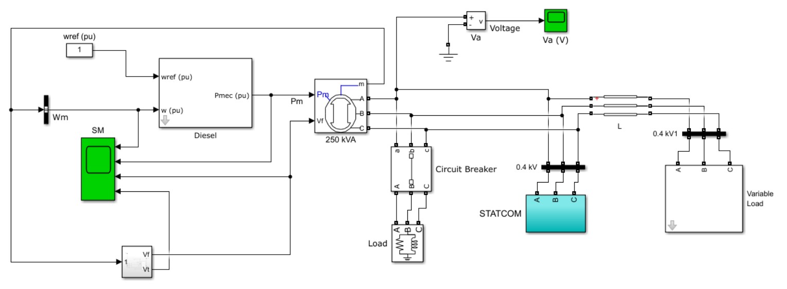 Рассмотрим возможности СТАТКОМа, направленные на повышение качества электроэнергии в удаленных системах электроснабжения с питанием в режиме резервирования от дизель-генераторных установок, на основе имитационного моделирования.